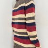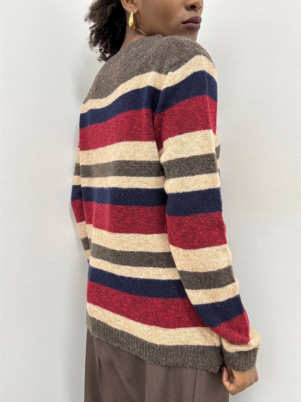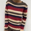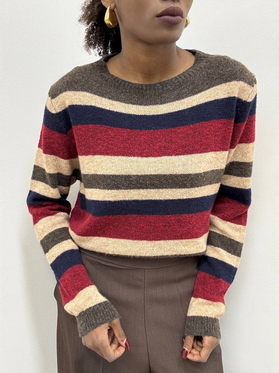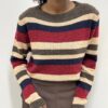 Maglioncino a righe strette con motivo orizzontale alternato nei toni del cioccolato, beige, blu e bordeaux .Il modello presenta girocollo classico e una vestibilità confortevole grazie alla lavorazione elasticizzata, che assicura libertà di movimento e una linea armoniosa sul corpo. Un capo versatile, perfetto da indossare da solo o sotto giacche e blazer per un look curato e contemporaneo.