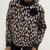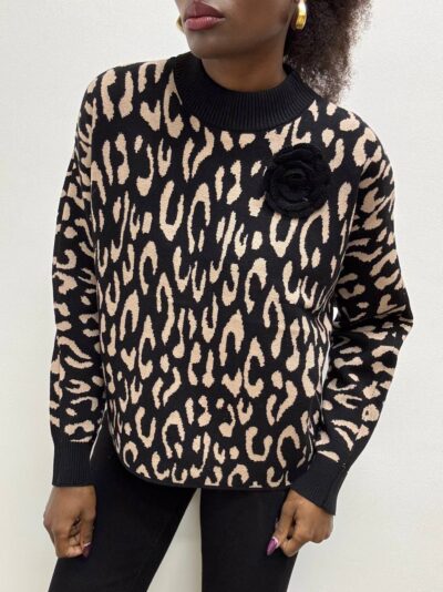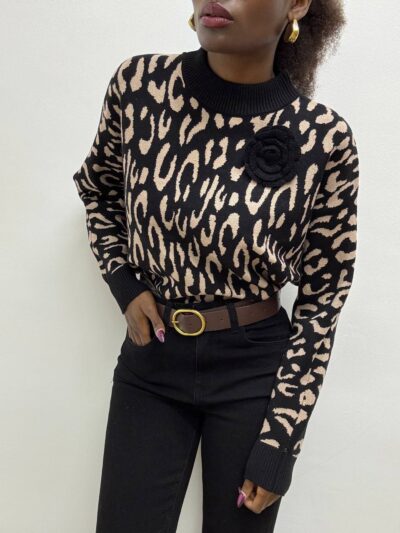 Elegante e grintoso, questo maglioncino a girocollo unisce stile e comfort in un design unico. La base nera si arricchisce di un audace motivo animalier nei toni del camel, creando un contrasto sofisticato e deciso.