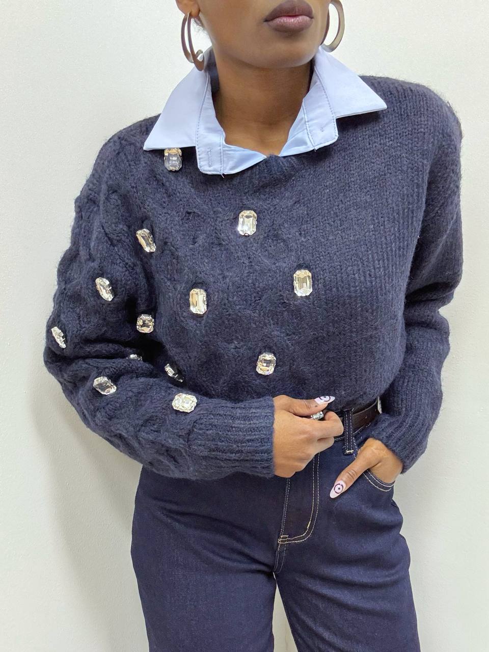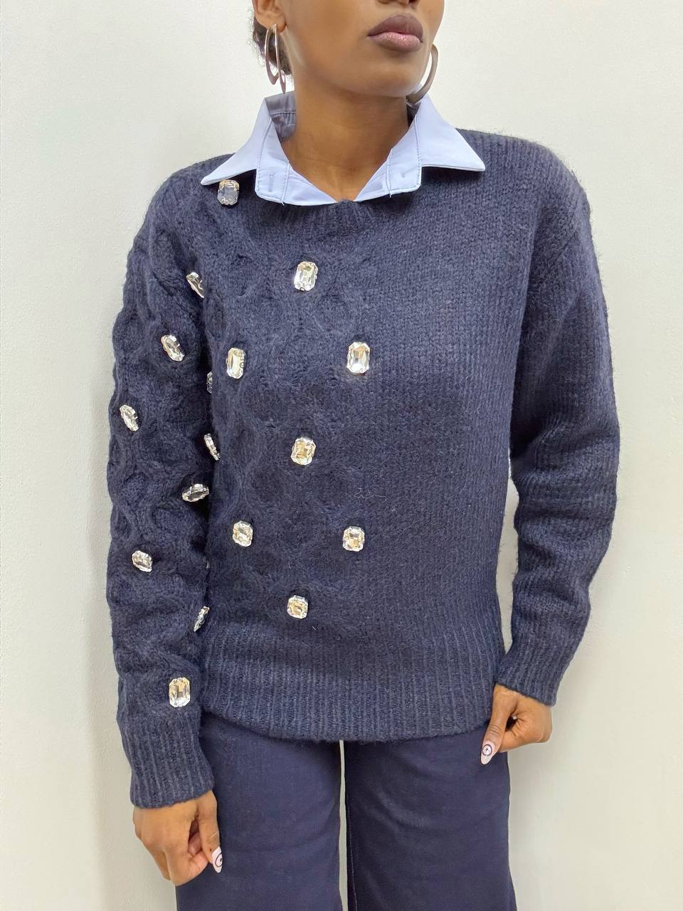 Maglioncino a girocollo dal design raffinato, impreziosito con zirconi cuciti che percorrono tutta la lunghezza, creando un elegante gioco di luce e texture. Realizzato in filato elasticizzato a costine, avvolge la silhouette valorizzandola con una vestibilità confortevole e femminile. Un capo versatile e ricercato, perfetto per dare un tocco sofisticato sia ai look quotidiani che agli outfit più eleganti. Lavaggio delicato.