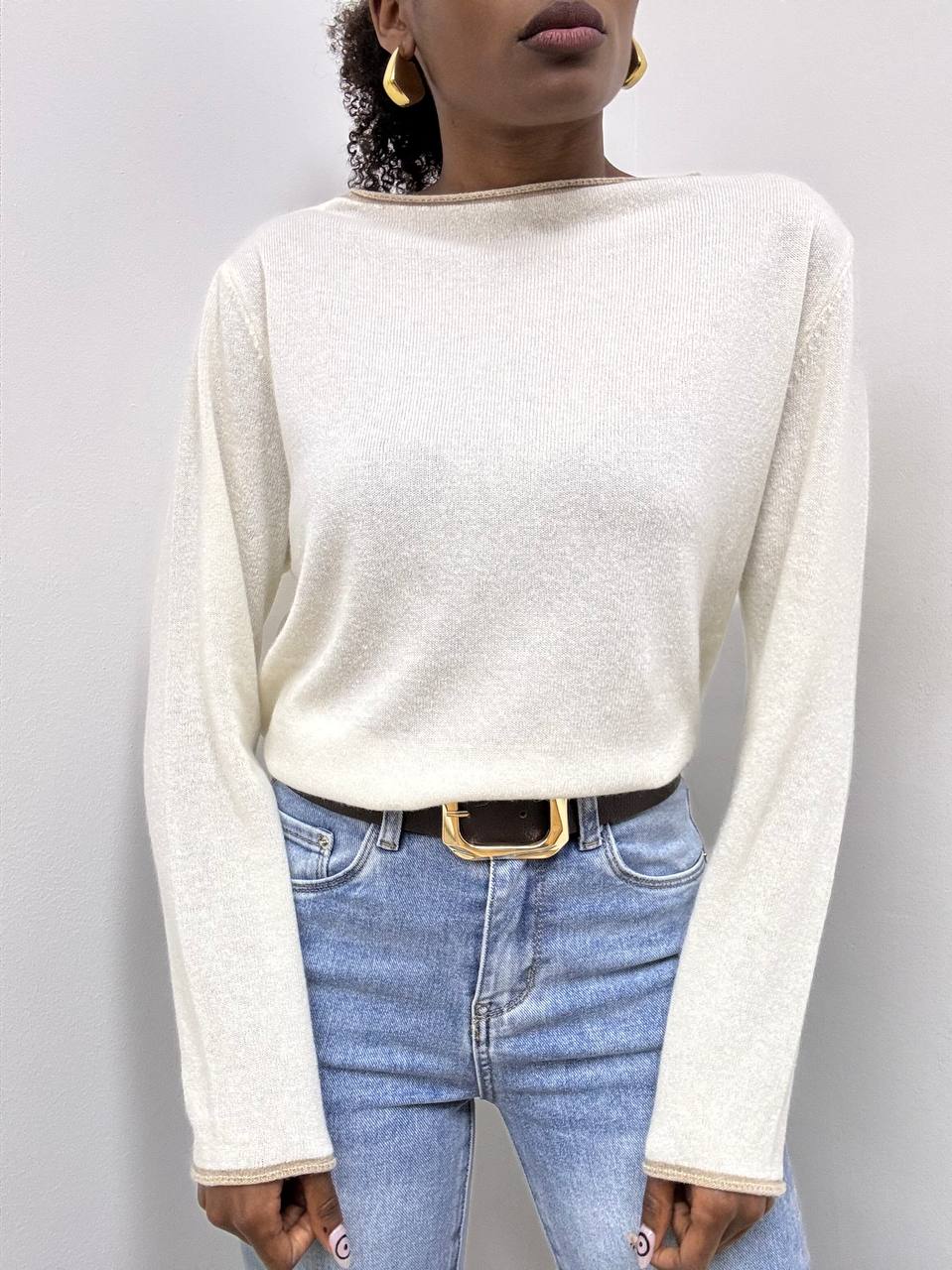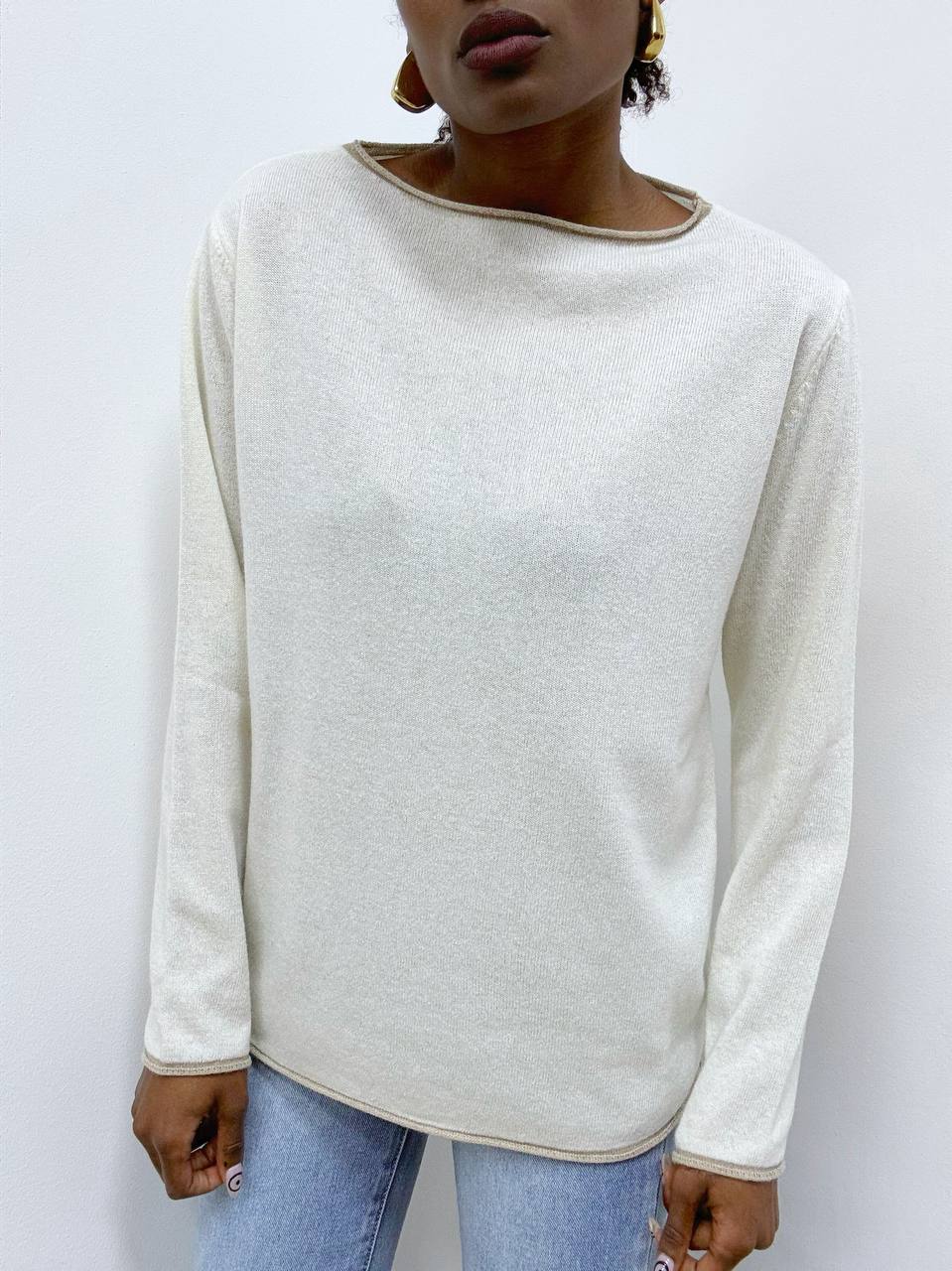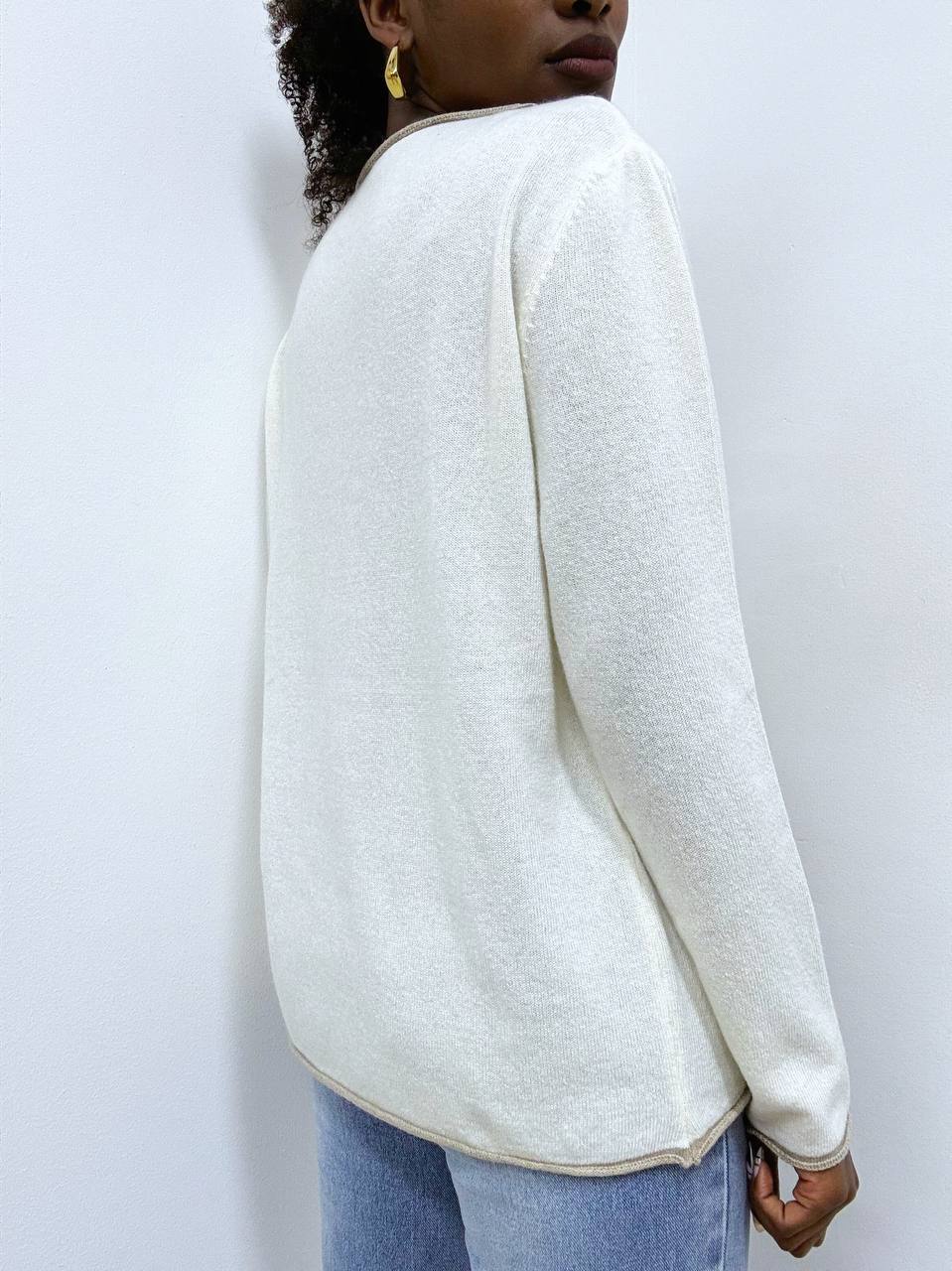 Maglioncino a girocollo realizzato in morbida maglia, caratterizzato da raffinati bordi color biscotto a contrasto che decorano il collo, i polsini e l’orlo inferiore. Il design pulito ed essenziale è valorizzato dai dettagli a contrasto, che donano al capo un tocco moderno e ricercato. Confortevole e facile da indossare, è ideale per completare look casual-chic o per aggiungere un elemento di stile a outfit più curati.