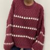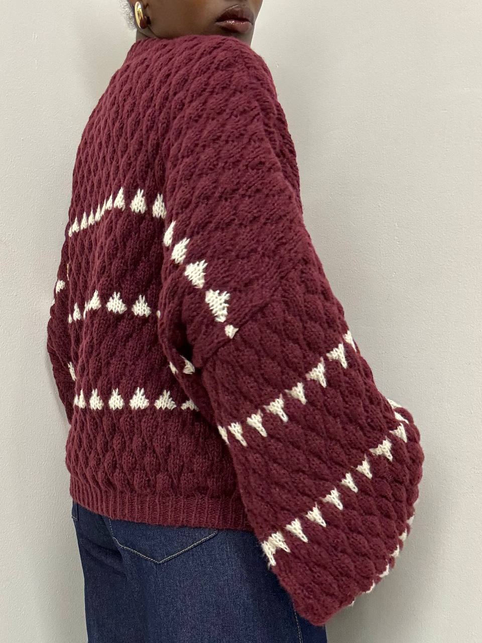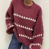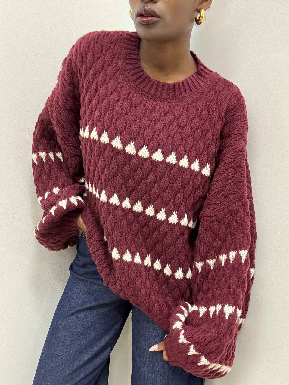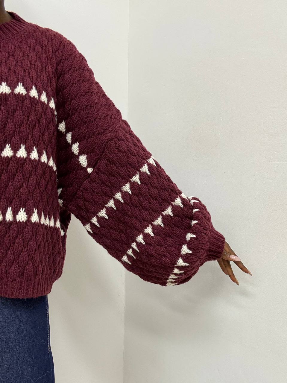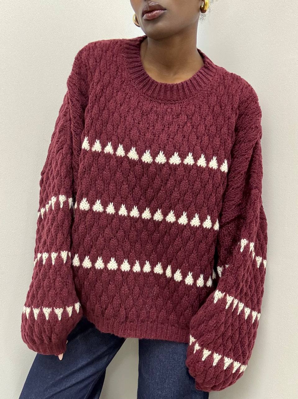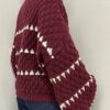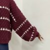 Maglione a maglia grossa con scollo rotondo, realizzato in 100% poliestere di alta qualità per garantire morbidezza, comfort e lunga durata nel tempo. Il design è impreziosito da un motivo a pallini bianchi, disposti in delicate strisce orizzontali e in raffinate file a V che valorizzano il busto e le maniche. Le maniche a palloncino donano un tocco romantico e femminile, mentre la texture corposa avvolge con calore e stile. Un capo dal fascino sofisticato, perfetto per rendere unico ogni look quotidiano.