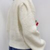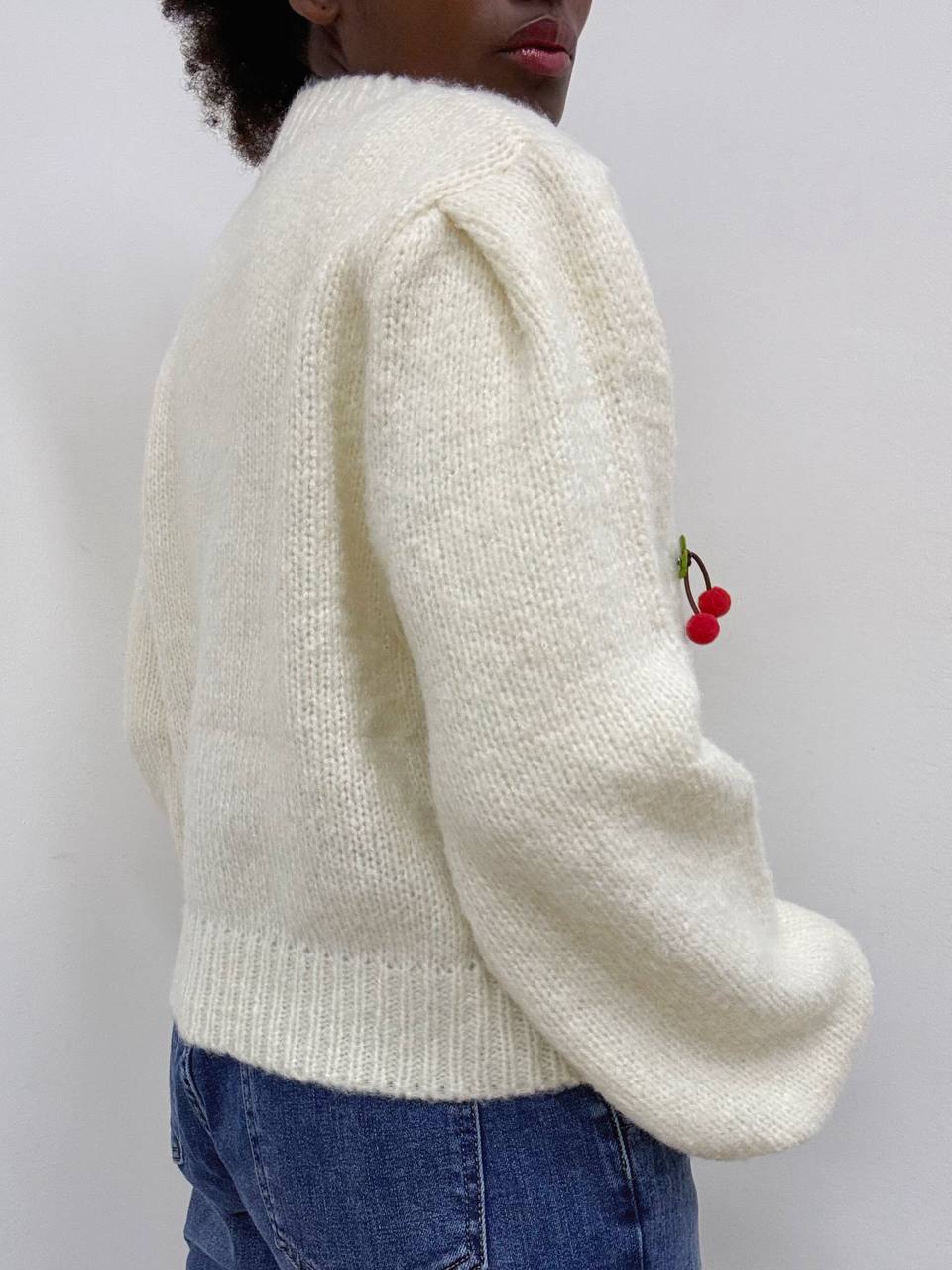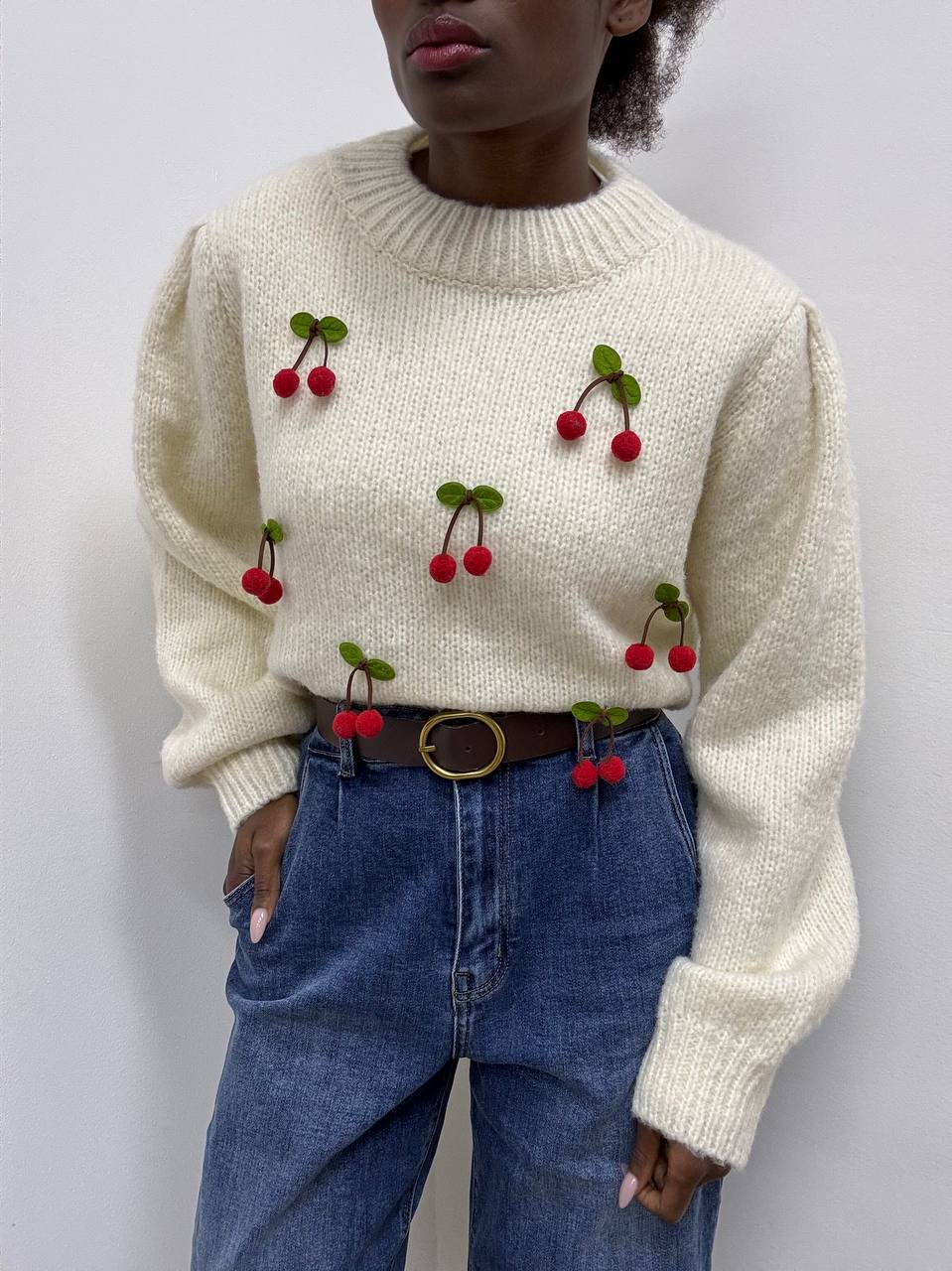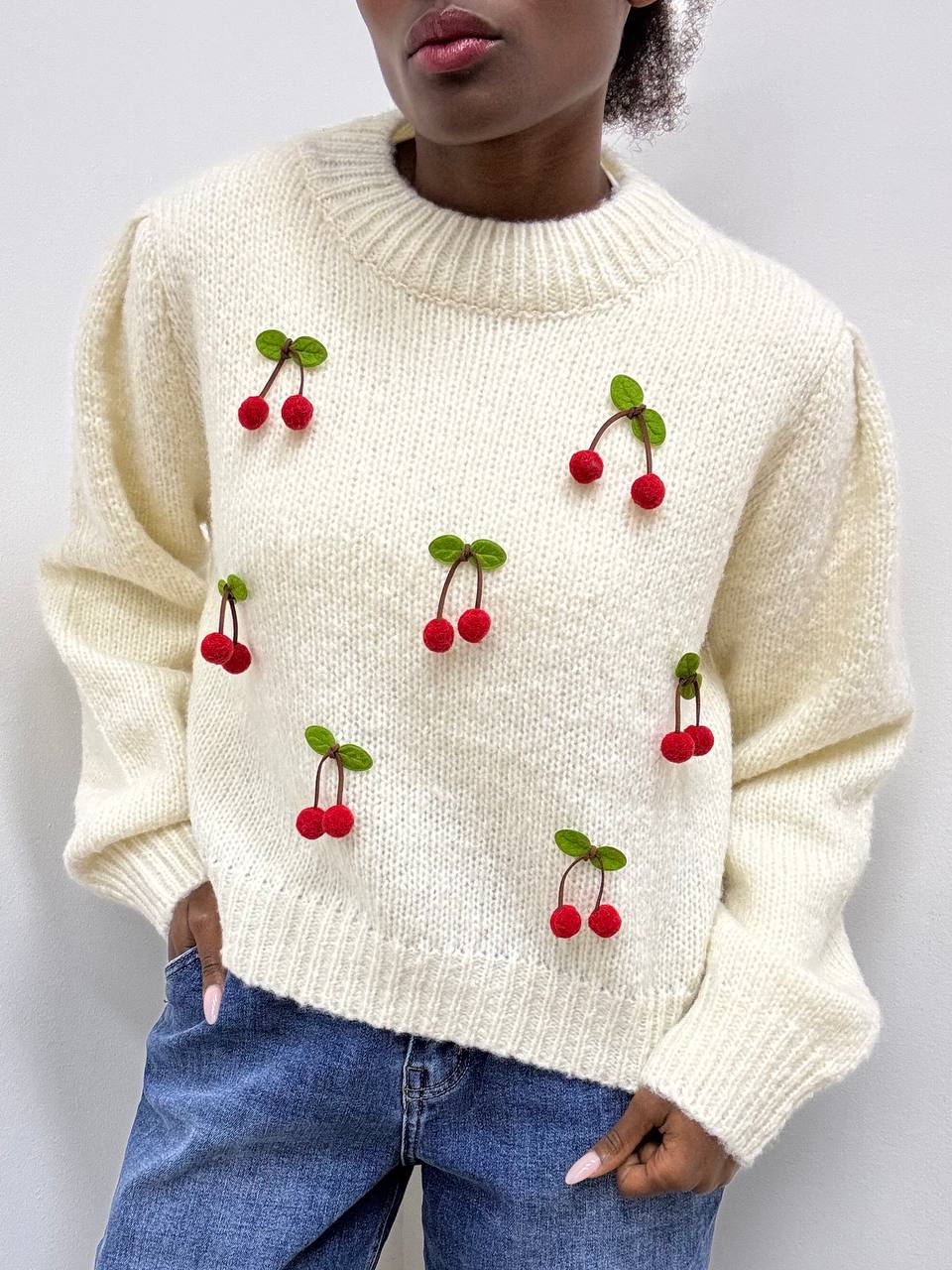 Delizioso maglioncino a girocollo a costine, realizzato in 100% poliestere di alta qualità, morbido e confortevole al tatto. Il design presenta maniche scivolate e polsini elasticizzati per una vestibilità rilassata ma sempre curata. Il capo è impreziosito da un dettaglio di spille decorative a forma di ciliegia, rimovibili per adattare lo stile a ogni occasione. Un modello originale e versatile, perfetto per aggiungere un tocco giocoso e chic ai tuoi outfit quotidiani.