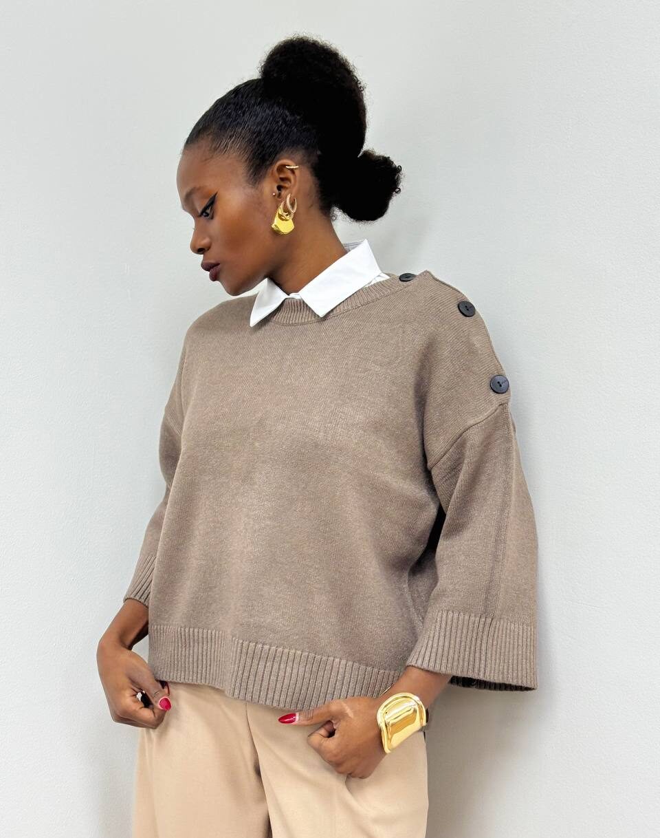 Maglia a girocollo a tinta unita con bottone sulla spalle con manica a tre quarti.