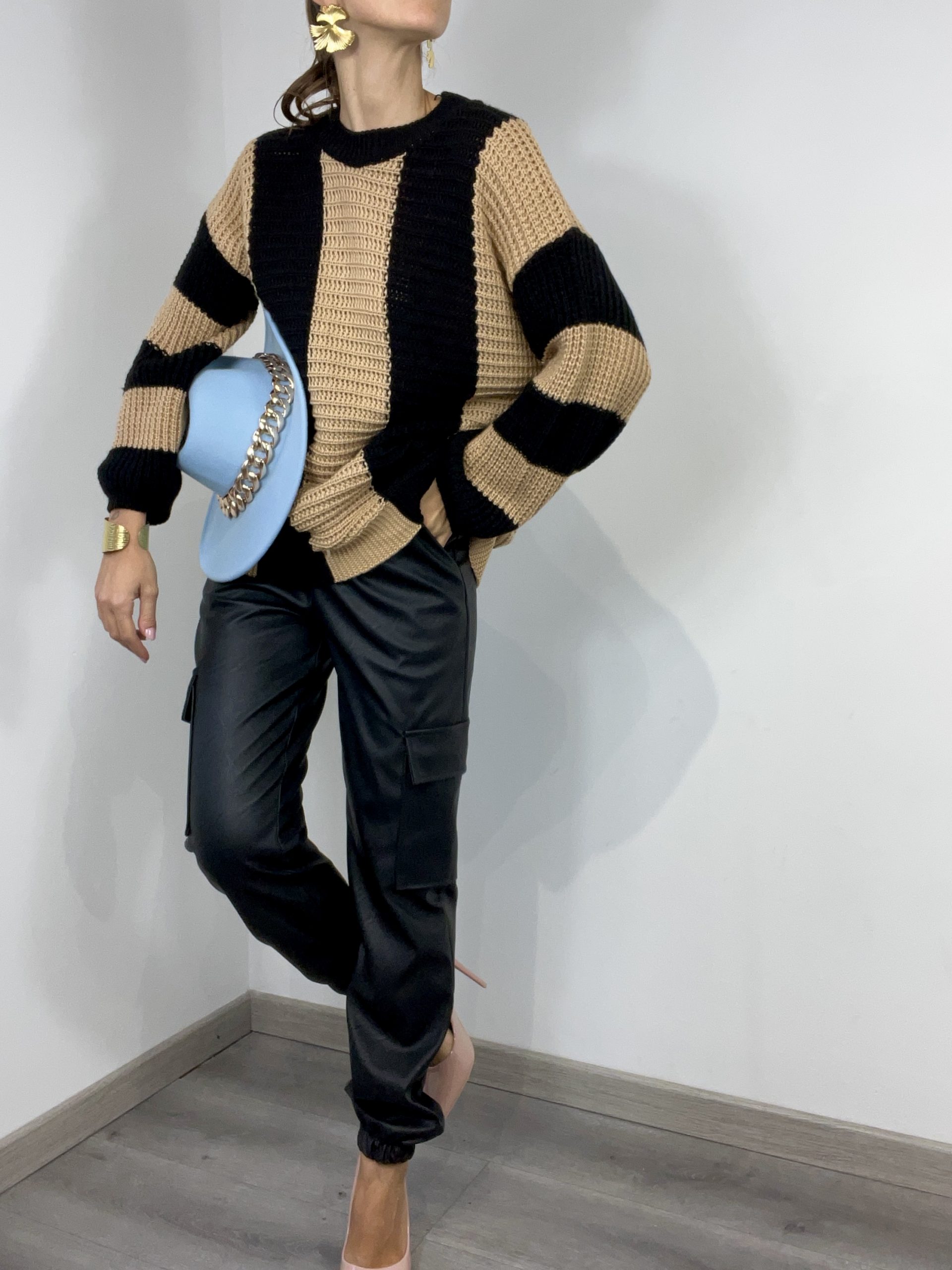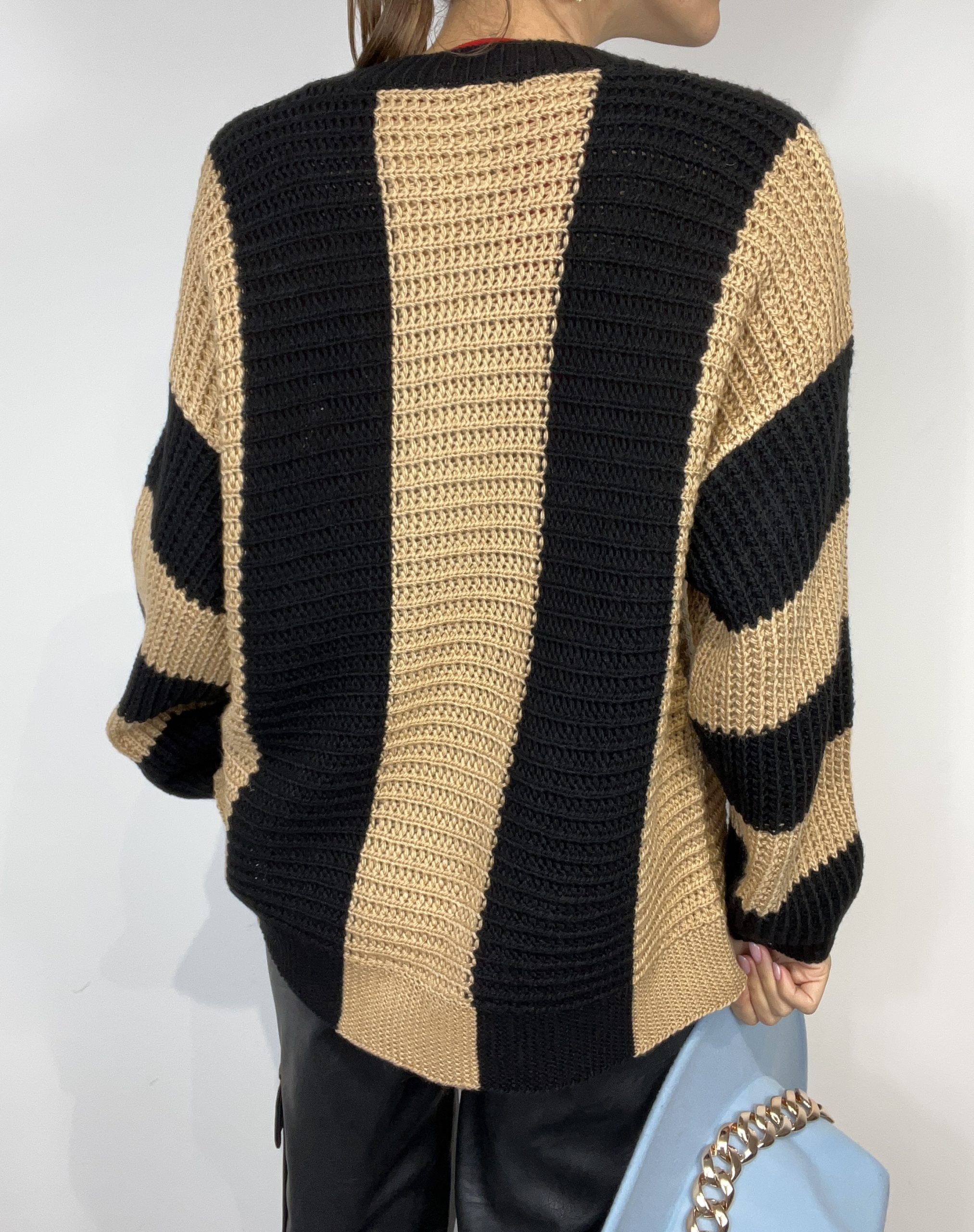 Maglione made in Italy con fasce di colore a contrasto. Tessuto elasticizzato e morbido.