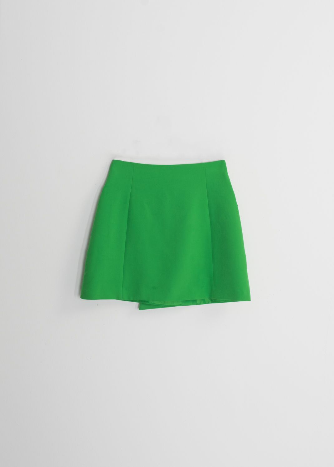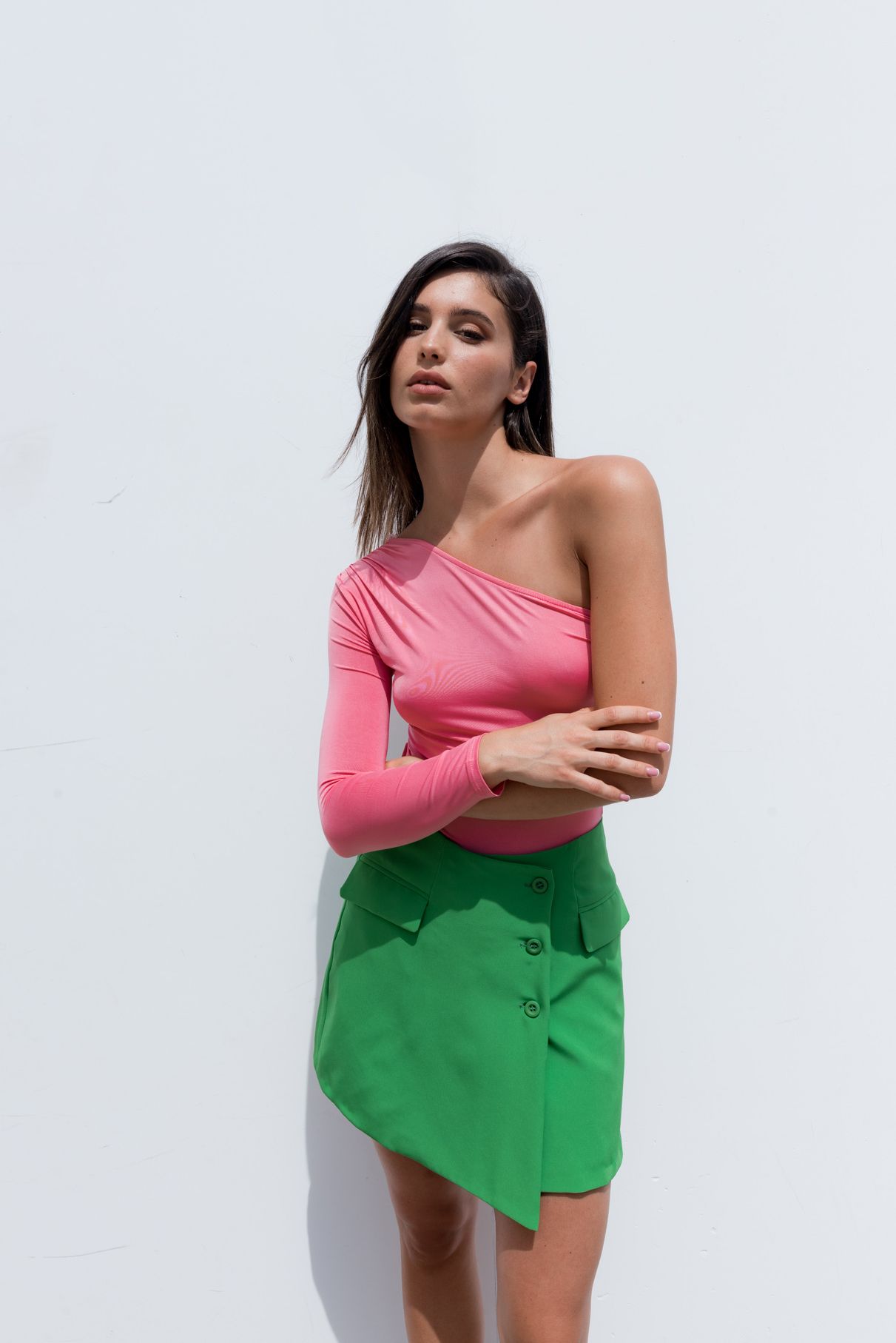 Minigonna con chiusura laterale da bottoni tono su tono e taschine laterali.