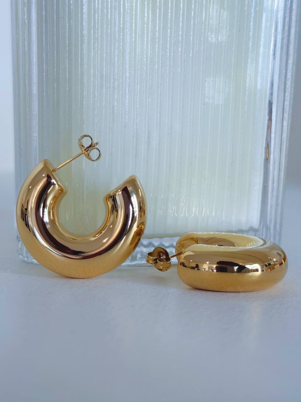 Orecchini a  mezzo cerchio a tinta unita.  Chiusura con ago e farfallina.