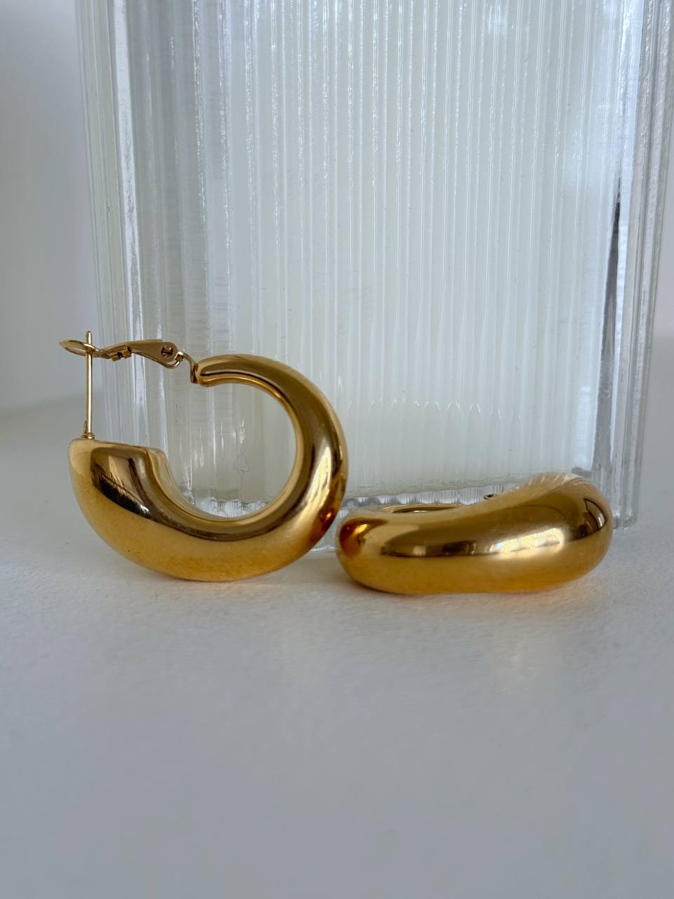 Gli orecchini classici a cerchio vengono reinterpretati in chiave moderna ed elegante, dando vita a un accessorio sofisticato e contemporaneo. Il design presenta una forma semicircolare spessa e arrotondata, caratterizzata da una struttura a tubo che dona volume, pienezza e una luminosità distintiva.