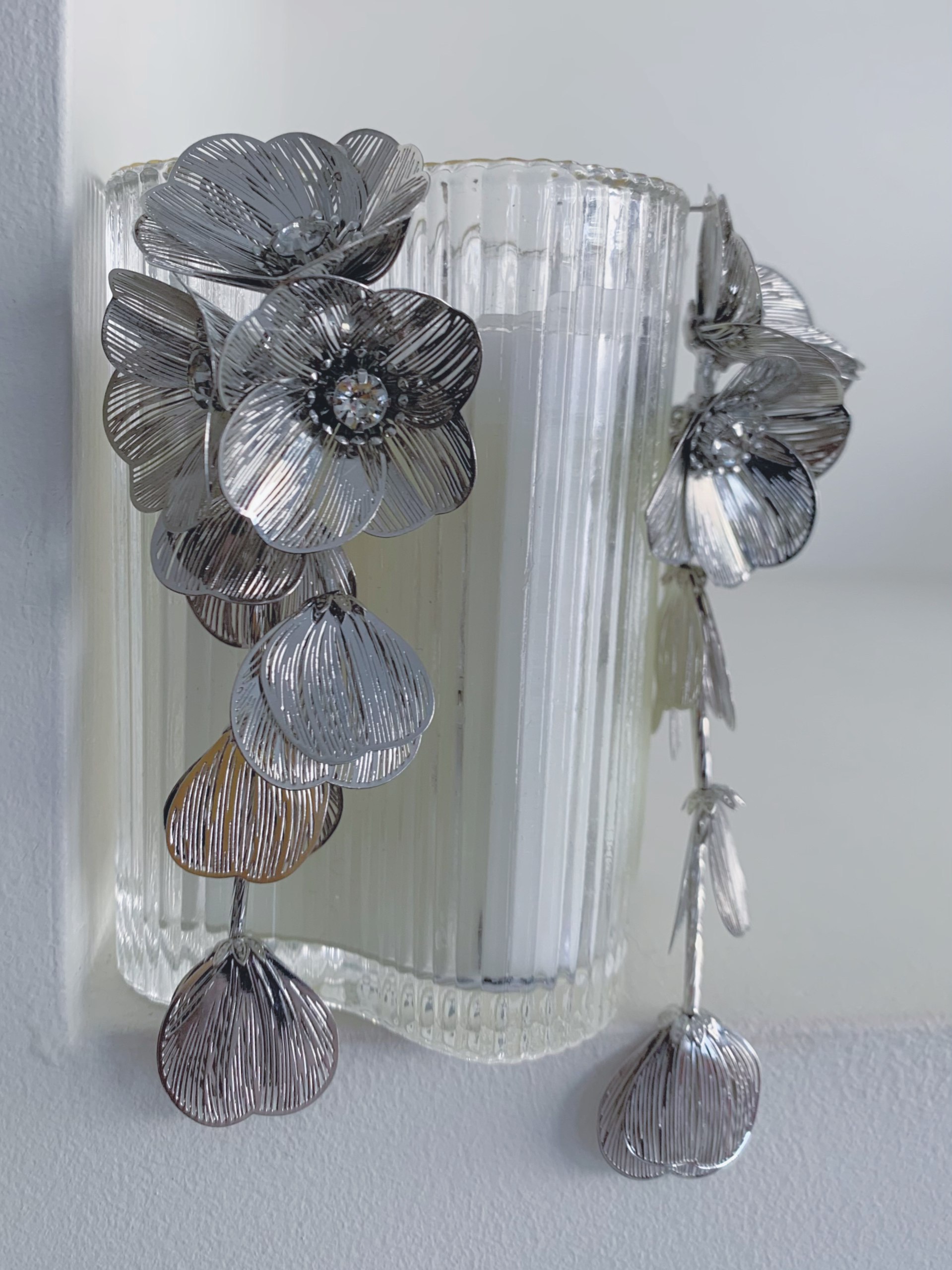 Orecchini con mega fiori pendenti con dettaglio di perla dentro il petalo. Chiusura con ago e farfallina.