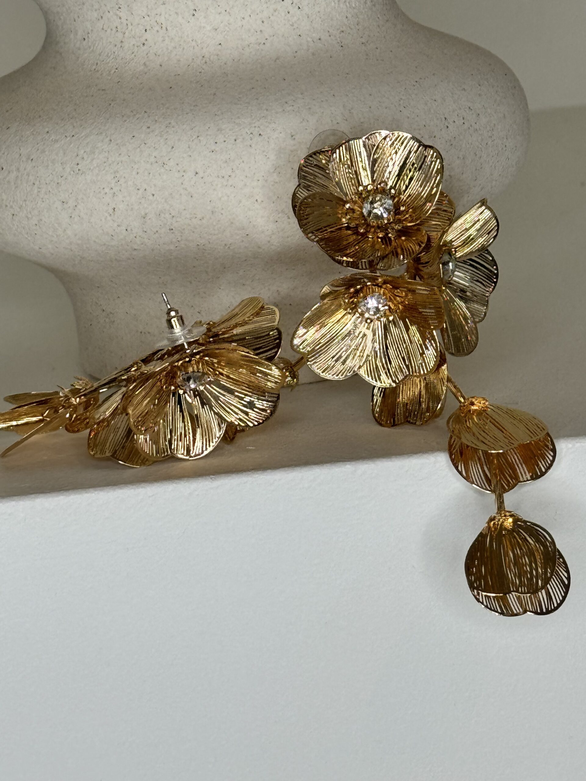 Orecchini con mega fiori pendenti con dettaglio di perla dentro il petalo. Chiusura con ago e farfallina.