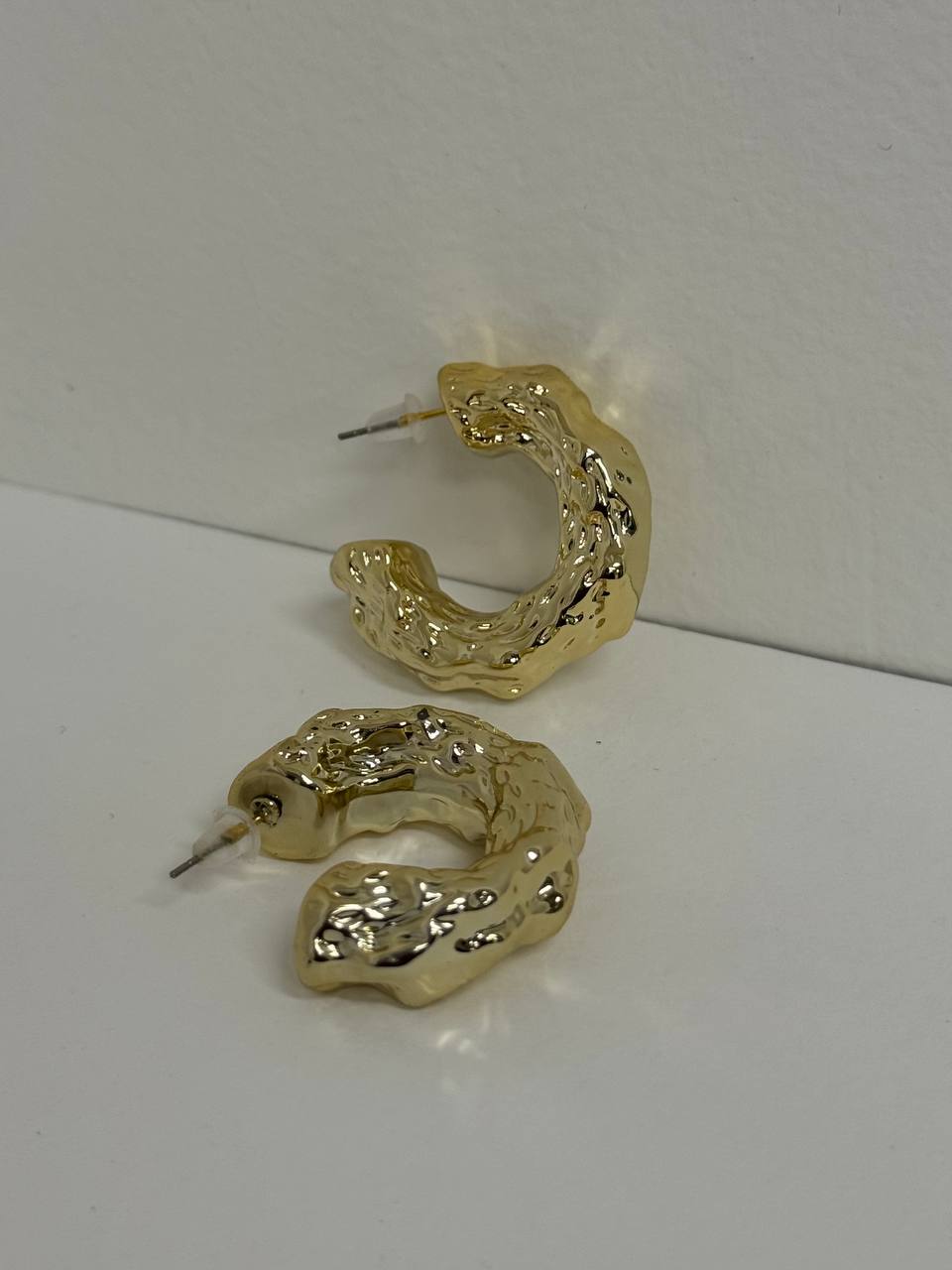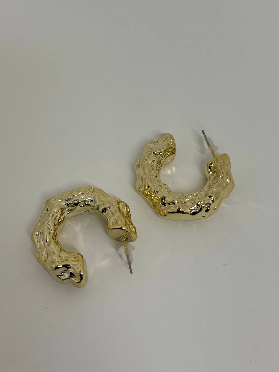 Orecchini a mezza luna martellati color oro. Chiusura con ago e farfallina.