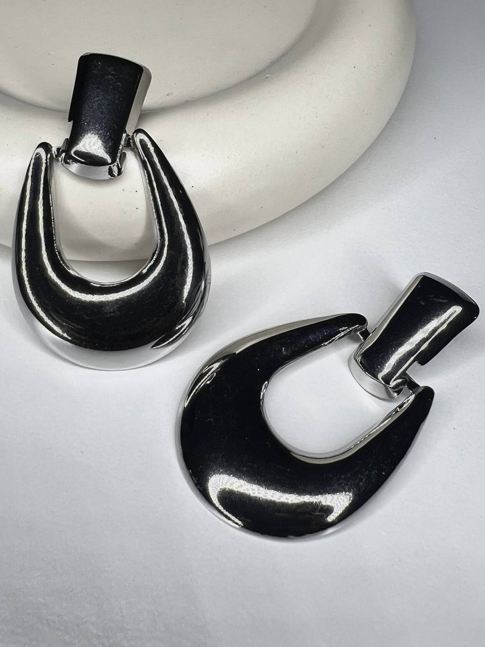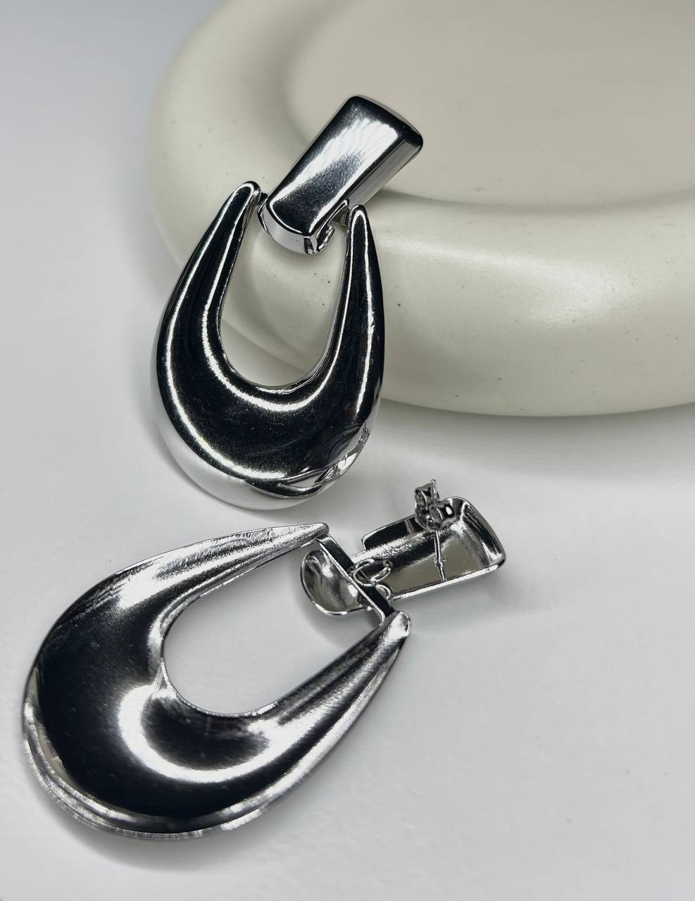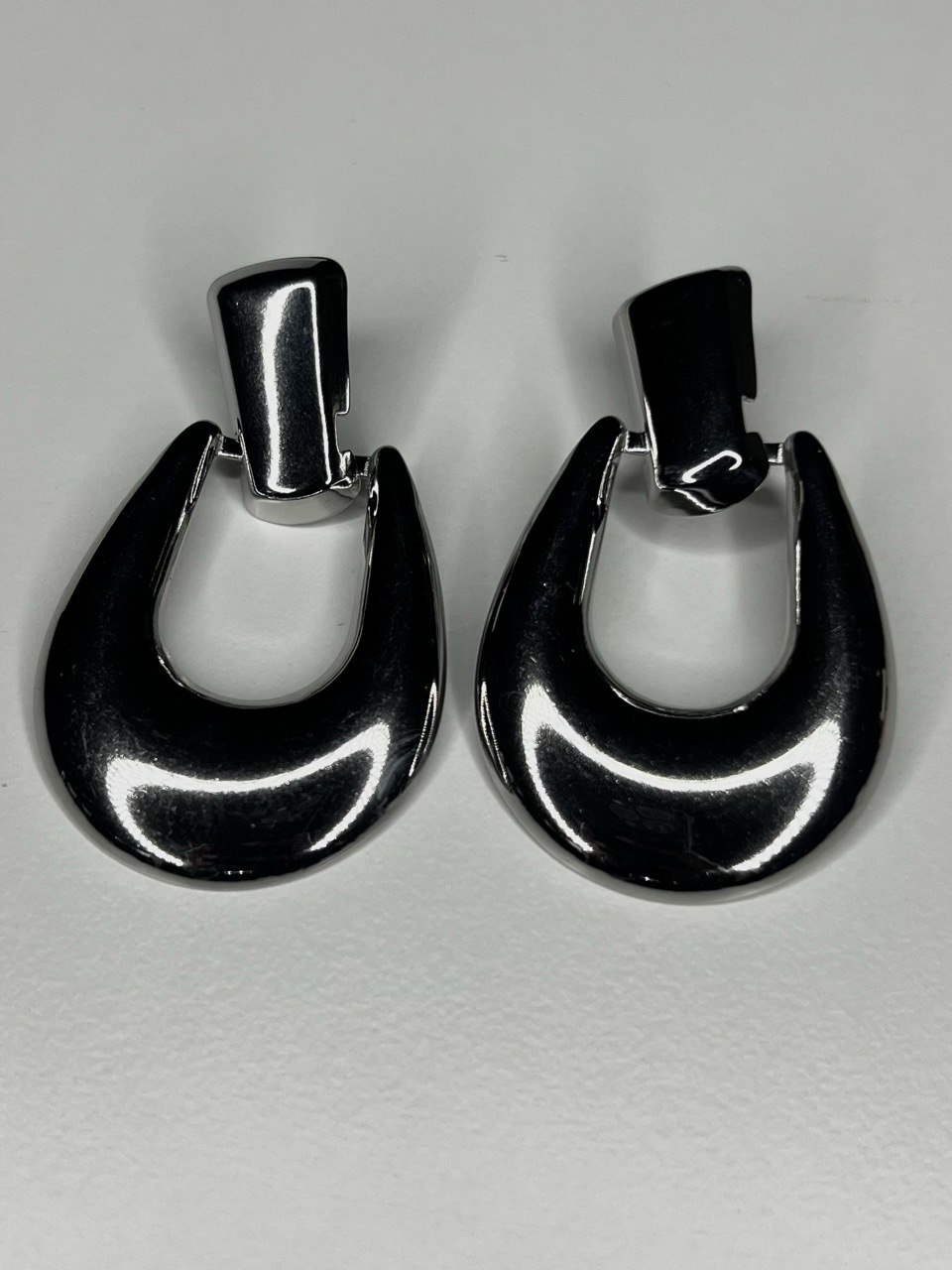 Orecchini a forma di U a tinta unita. Dettaglio di ago e farfallina.