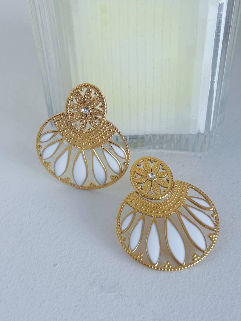 Orecchini a forma circolare con dettaglio di perla incastonata bianca. Dettaglio di ago e farfallina.