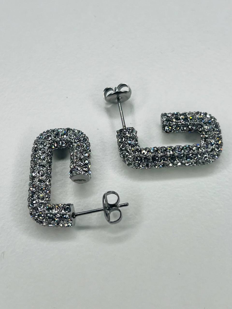 Orecchini a ferro di cavallo con strass incastonati su tutta la lunghezza. Chiusura con ago e farfallina.