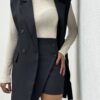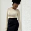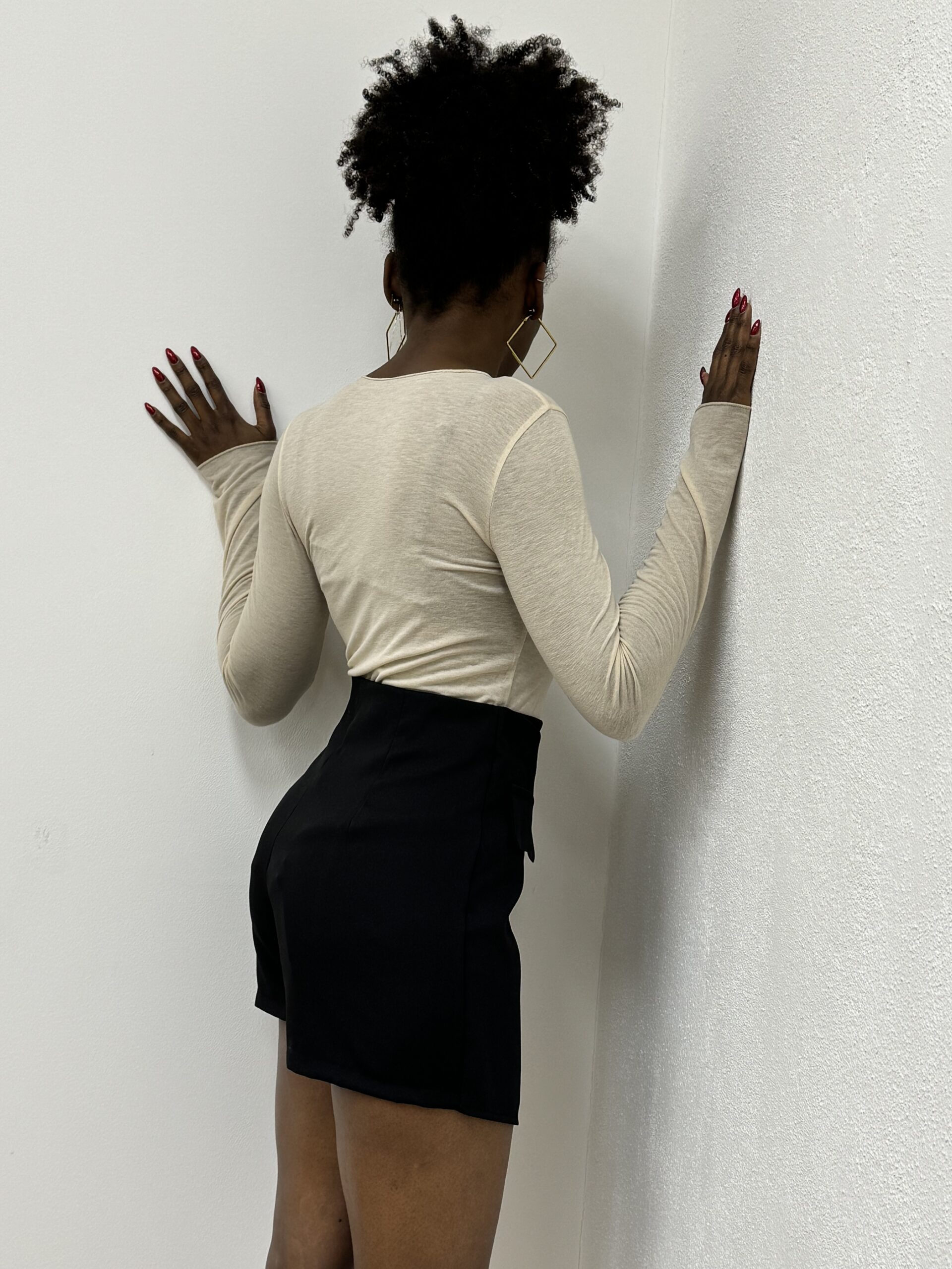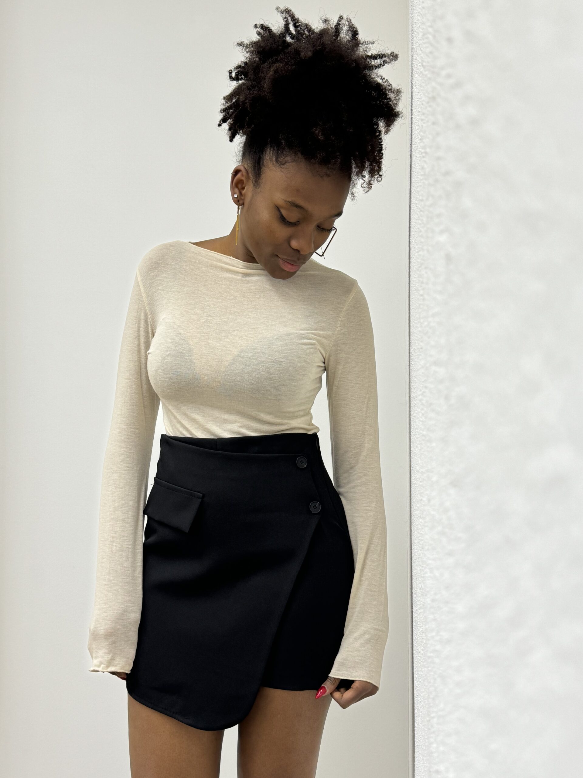 Pantagonna con dettaglio di chiusura a portafoglio con dettaglio di bottoni laterale. Finta taschina laterale.