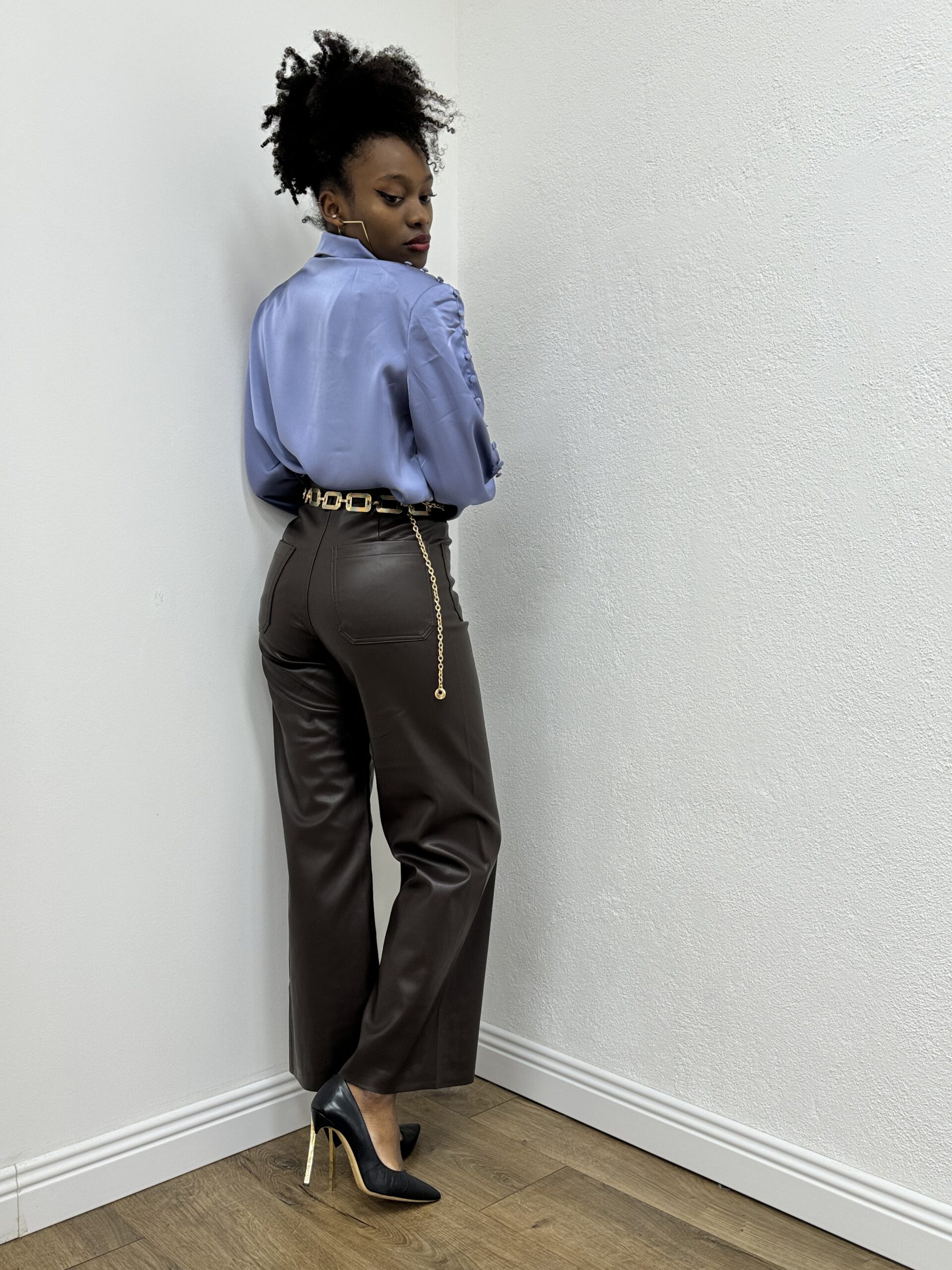 Pantaloni in ecopelle a vita alta con cuciture in evidenza. Gamba larga. Chiusura frontale con cerniera nascosta dal tessuto.