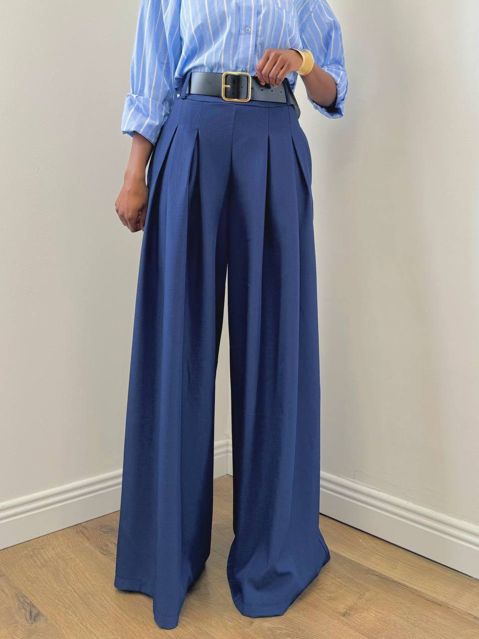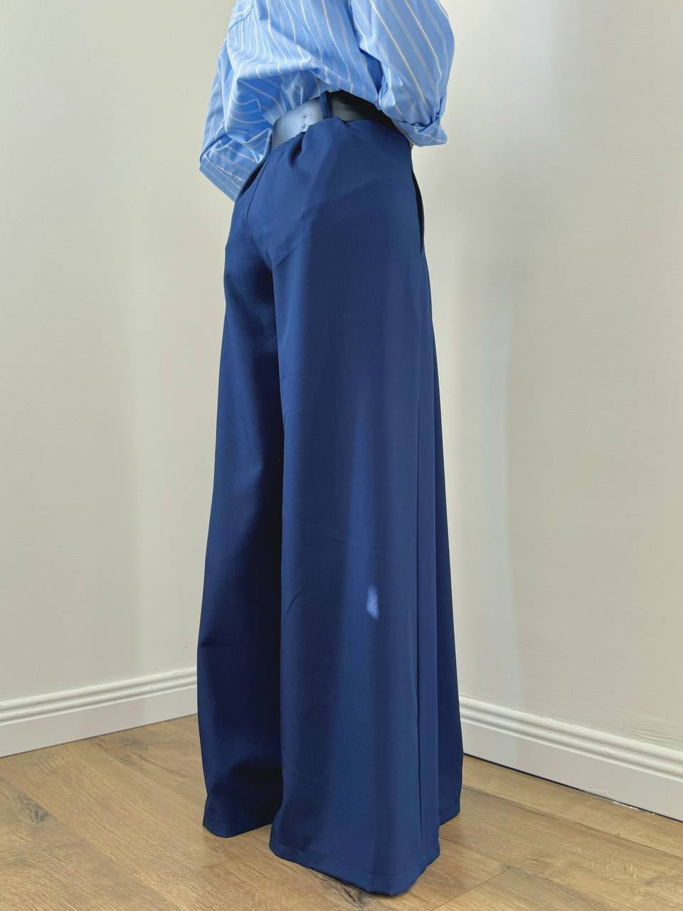 Pantalone a gamba larga con vita posteriore elasticizzata. Dettaglio di cintura sul punto vita.