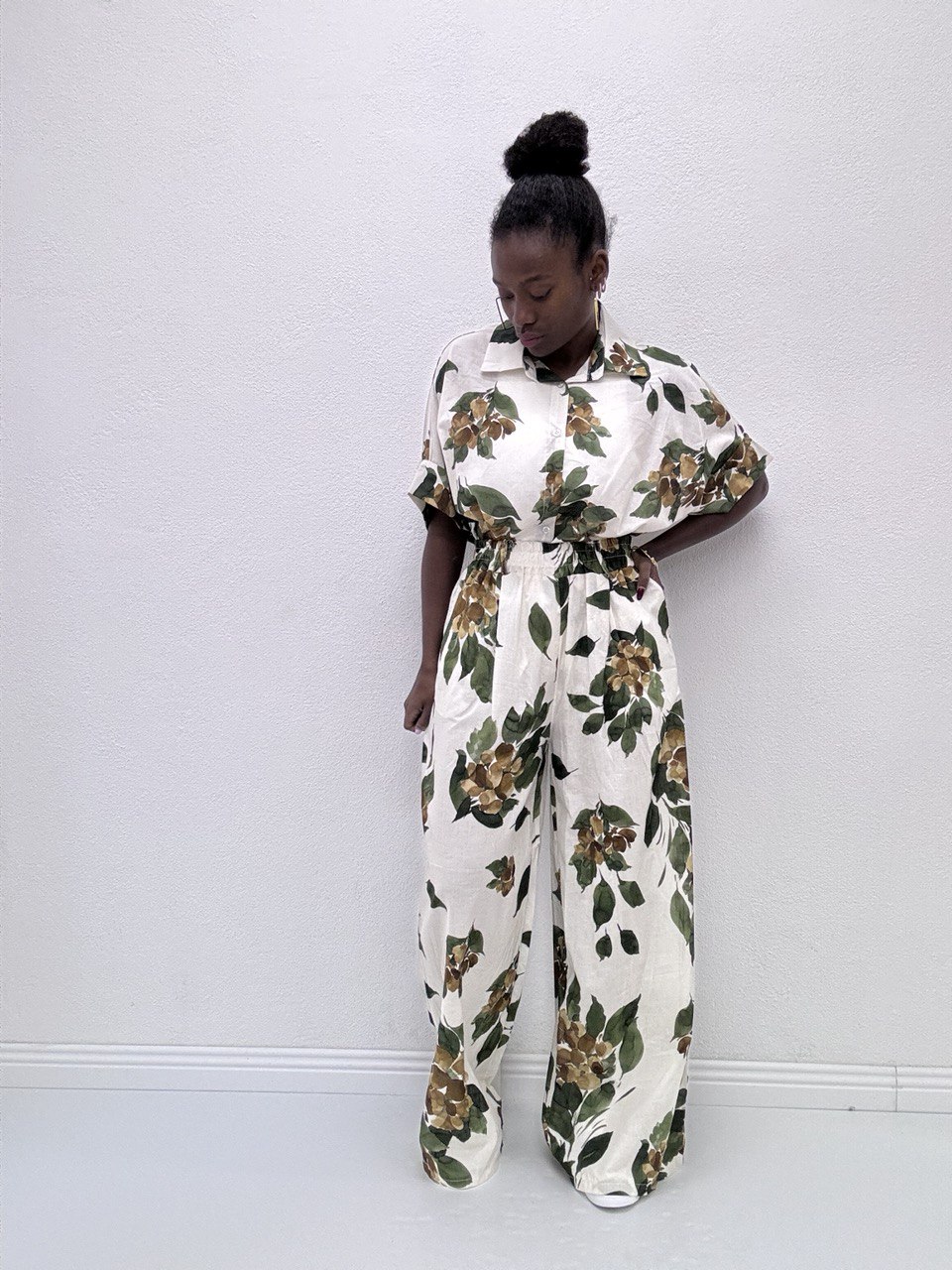 Pantalone elasticizzato con stampa fiorata su tutta la lunghezza a gamba larga.