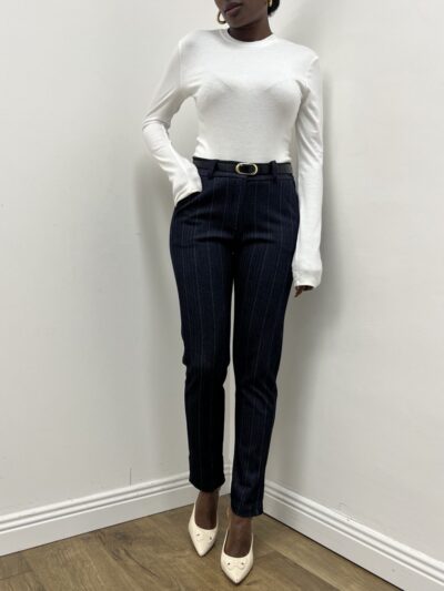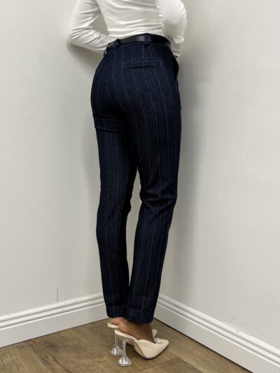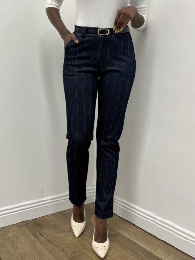 Raffinato e moderno, questo pantalone in viscosa elasticizzata effetto denim con riga di gesso leggera è pensato per chi cerca un equilibrio perfetto tra stile formale e comfort quotidiano. Il tessuto compatto e piacevolmente elastico dona al capo una vestibilità naturale che si adatta al corpo senza costringerlo, mantenendo una linea pulita e sofisticata.