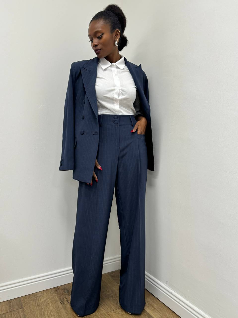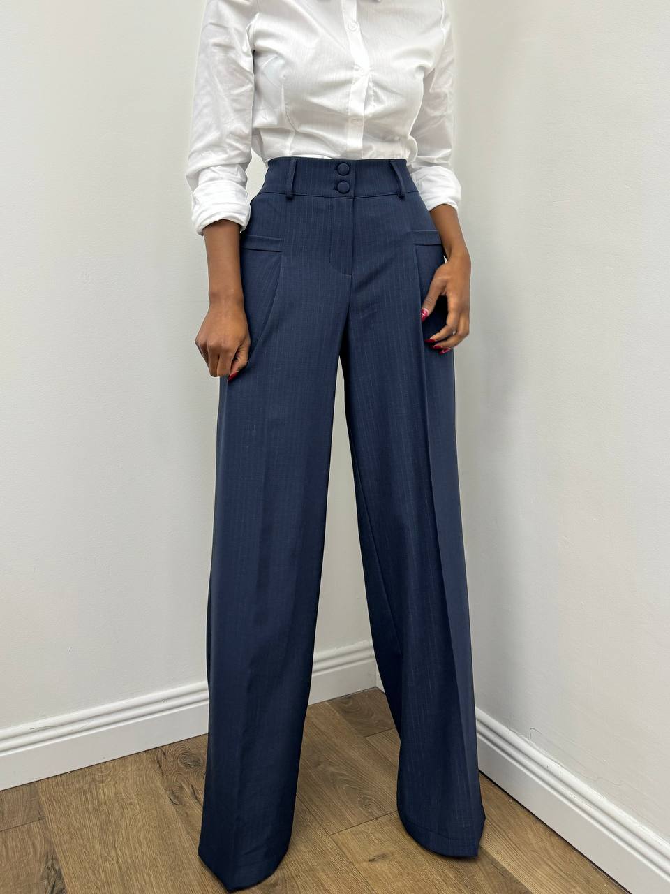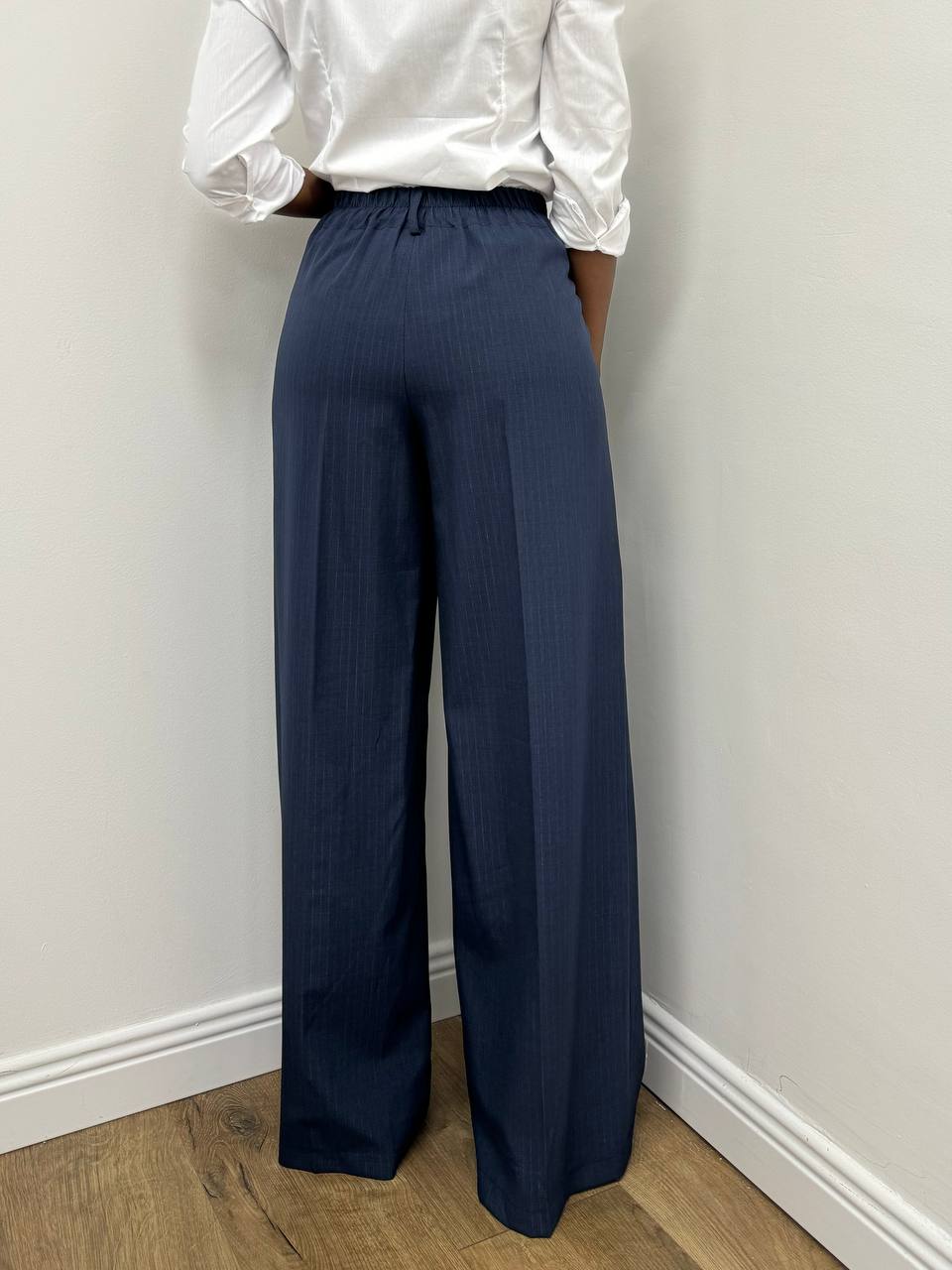 Pantalone elasticizzato gessato laminato a palazzo.
