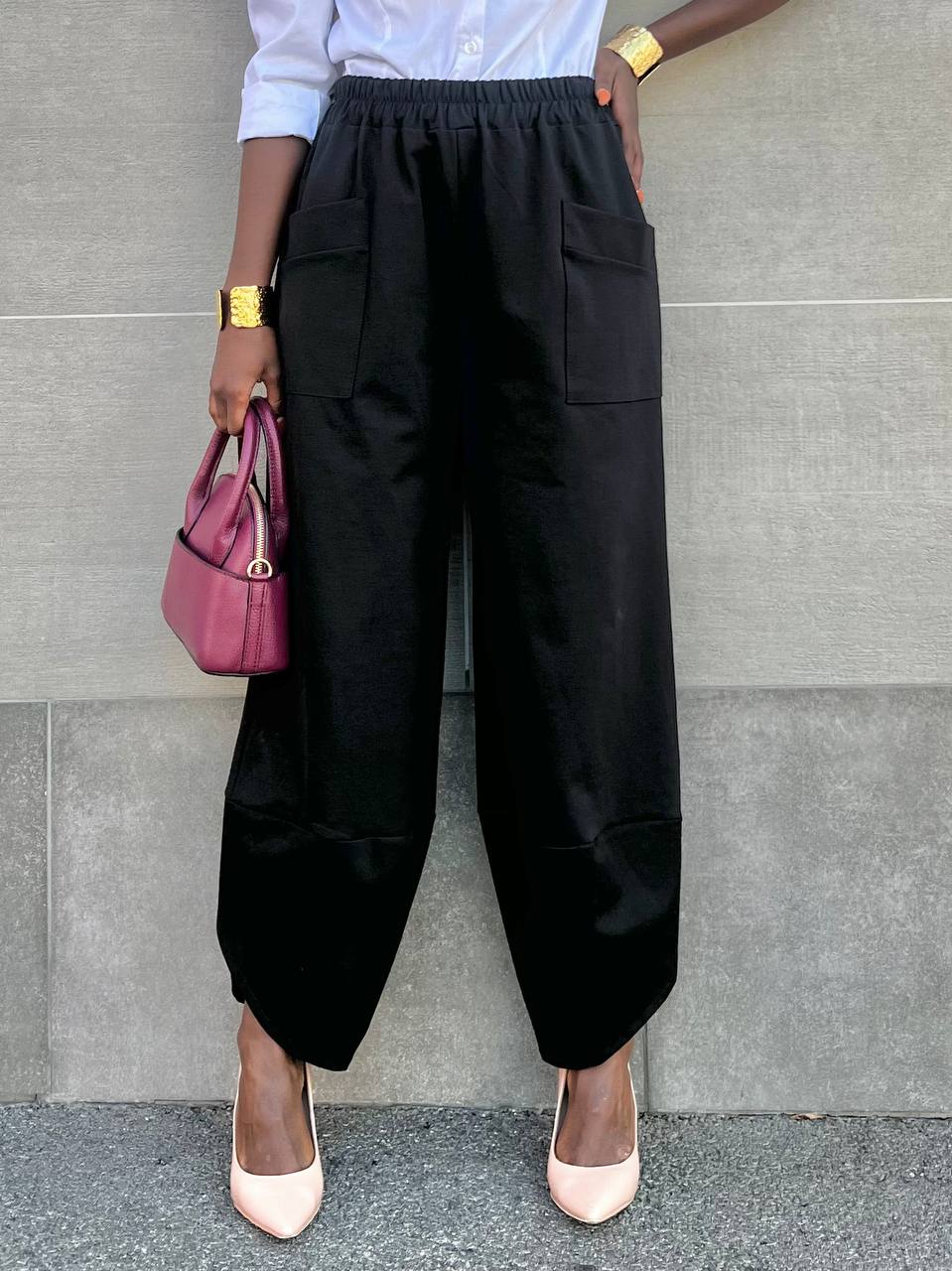 Pantalone elasticizzato a tinta unita con dettaglio tasche nella parte frontale.