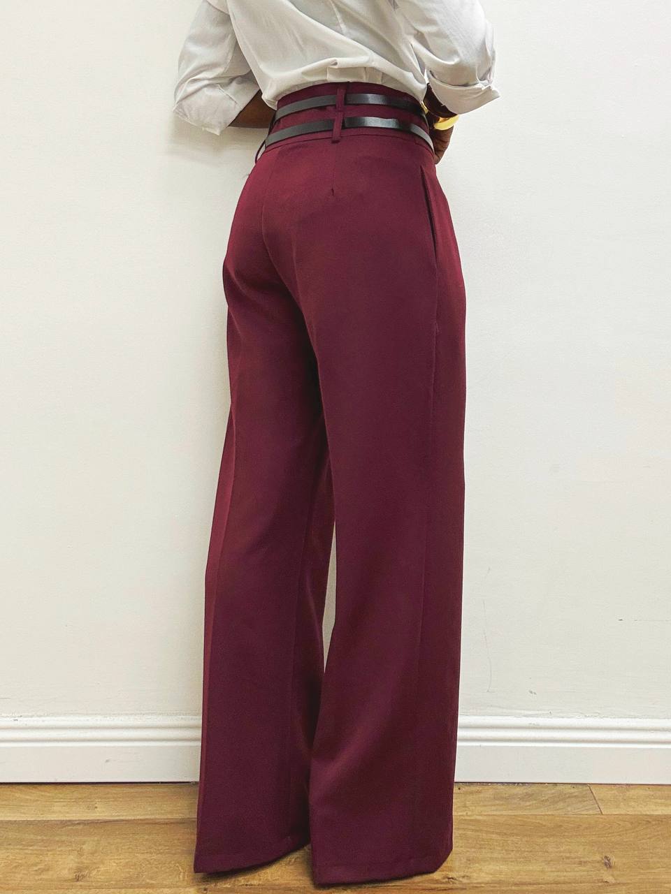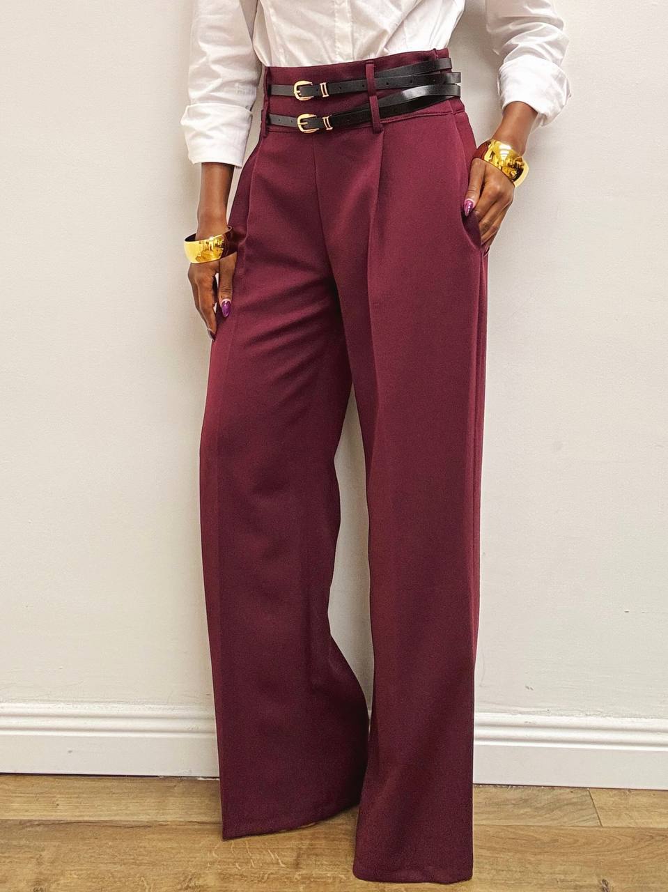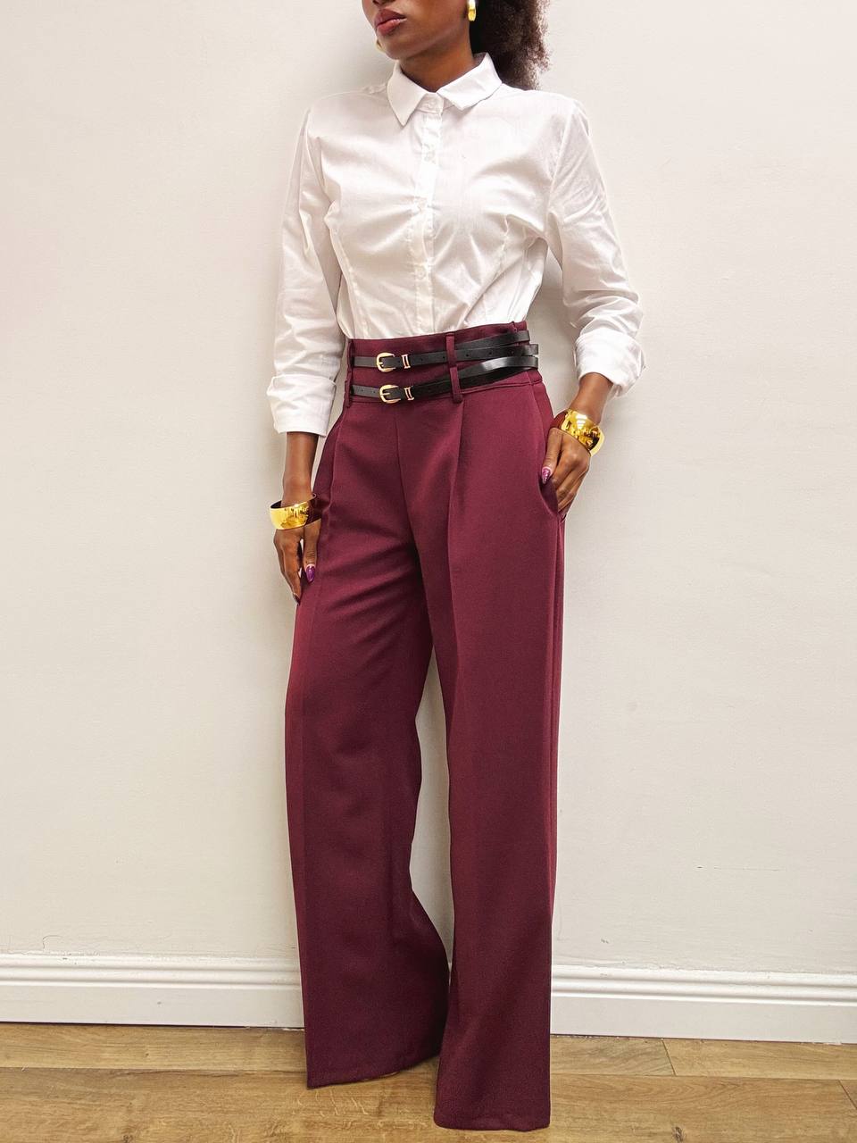 Pantalone a palazzo elegante e raffinato, caratterizzato da una silhouette ampia e fluida che dona slancio alla figura. Il design presenta un doppio cinturino sul punto vita, che aggiunge un tocco strutturato e moderno, valorizzando la linea del busto. La chiusura è affidata a una zip laterale invisibile, che garantisce una vestibilità pulita e minimale. Completano il capo due taschine a filo laterali che mantengono lo stile essenziale del pantalone. Perfetto per look da ufficio o serate eleganti, da abbinare a camicie morbide o top aderenti.