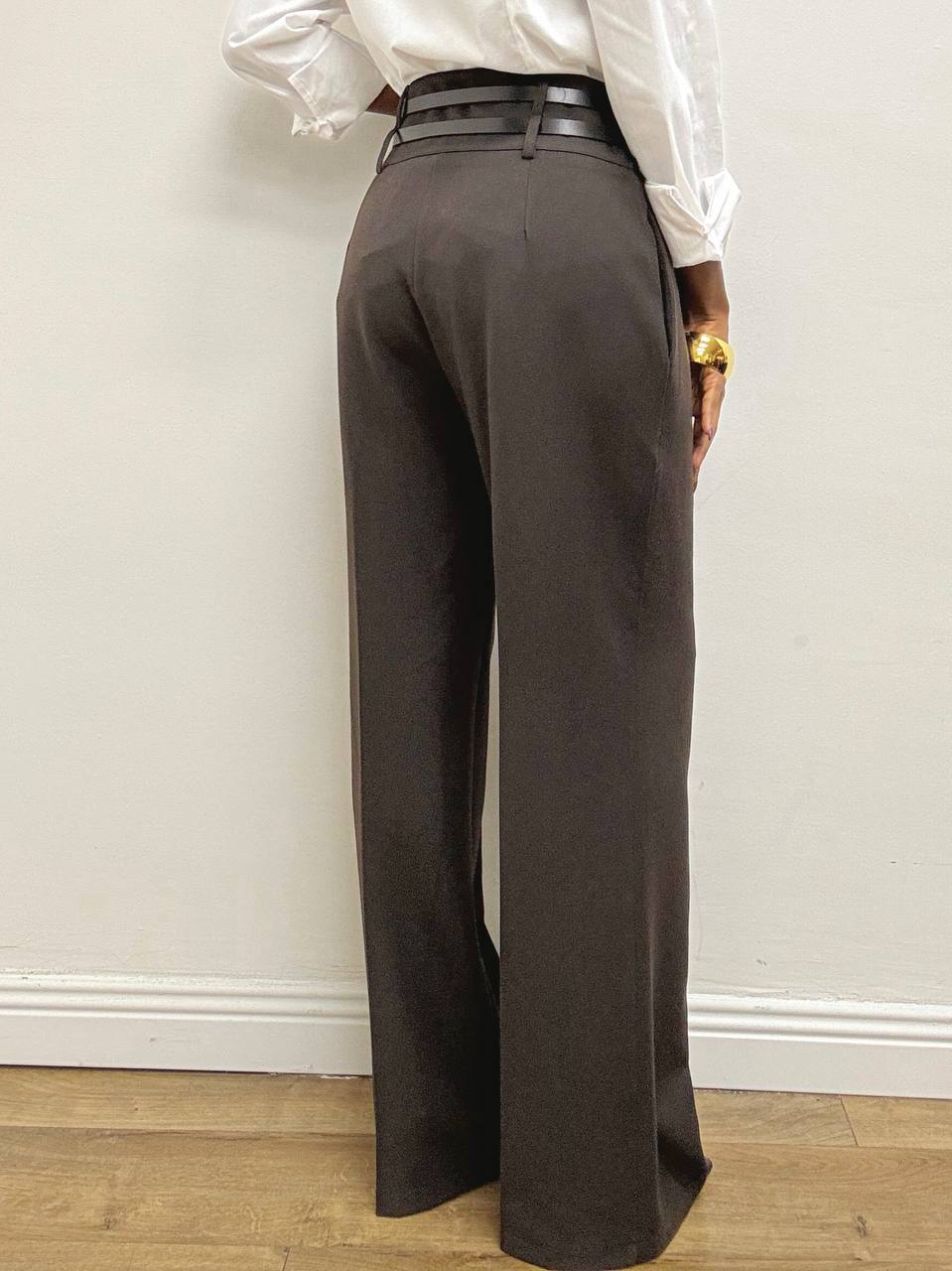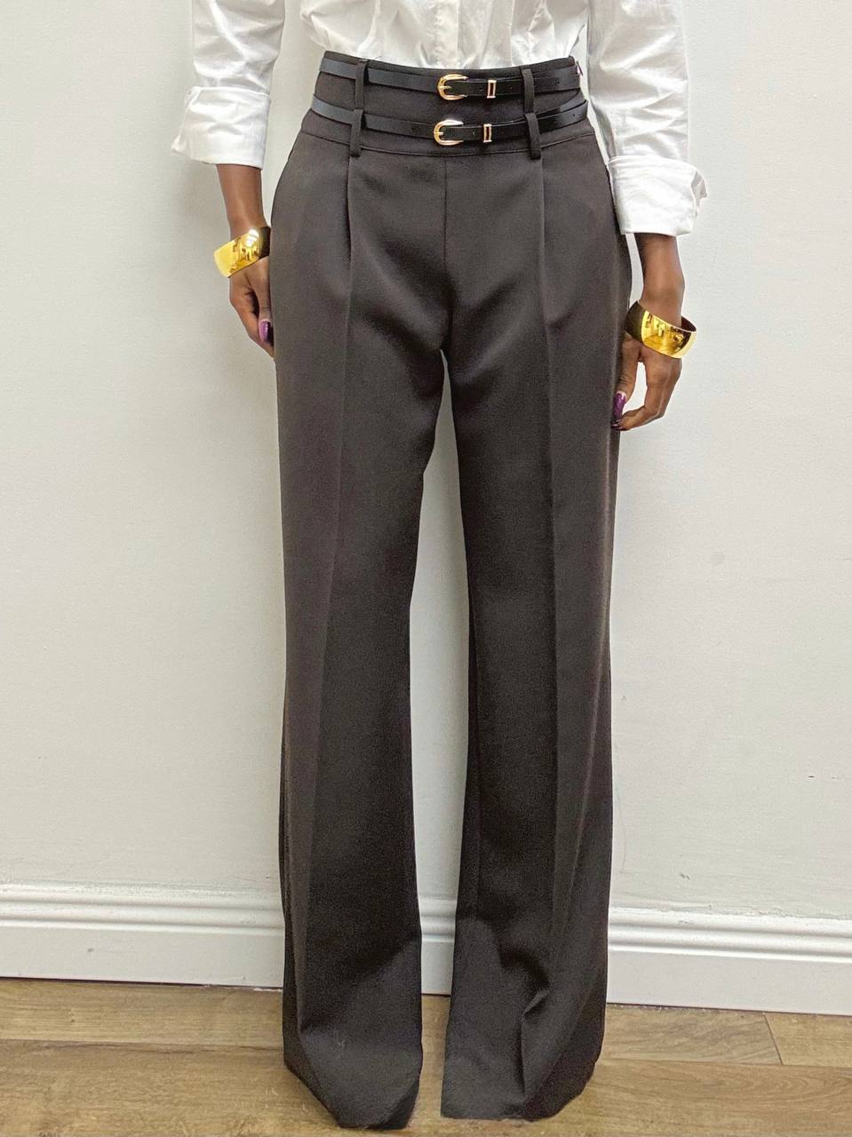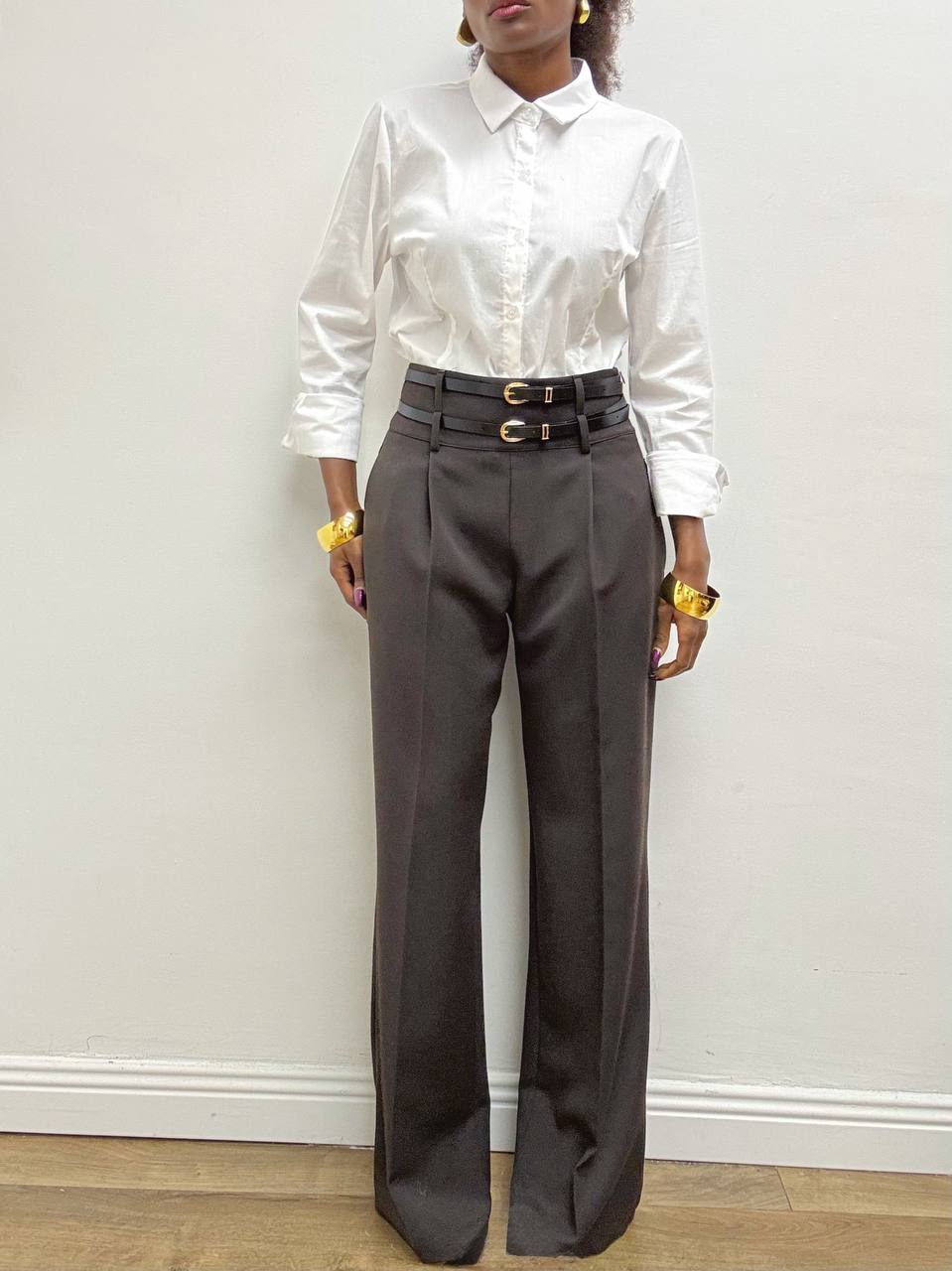 Pantalone a palazzo elegante e raffinato, caratterizzato da una silhouette ampia e fluida che dona slancio alla figura. Il design presenta un doppio cinturino sul punto vita, che aggiunge un tocco strutturato e moderno, valorizzando la linea del busto. La chiusura è affidata a una zip laterale invisibile, che garantisce una vestibilità pulita e minimale. Completano il capo due taschine a filo laterali, che mantengono lo stile essenziale del pantalone. Perfetto per look da ufficio o serate eleganti, da abbinare a camicie morbide o top aderenti.