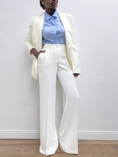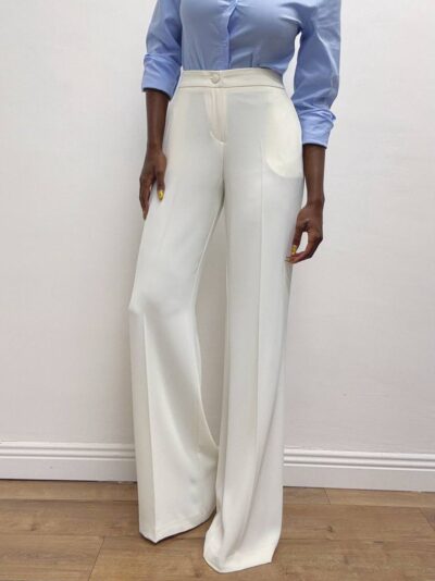 Pantalone a vita alta elasticizzata sulla parte posteriore a palazzo con taschine laterali.