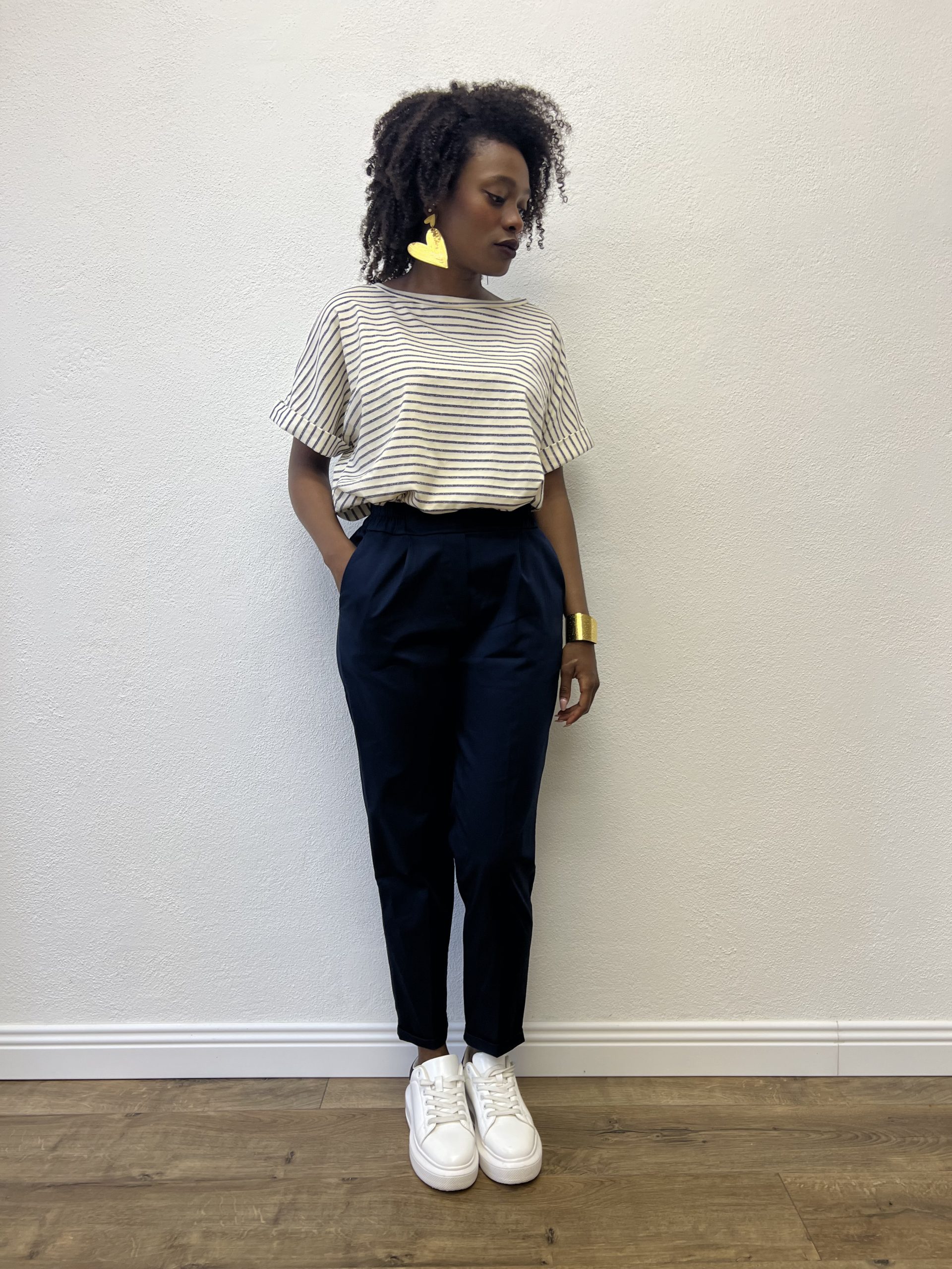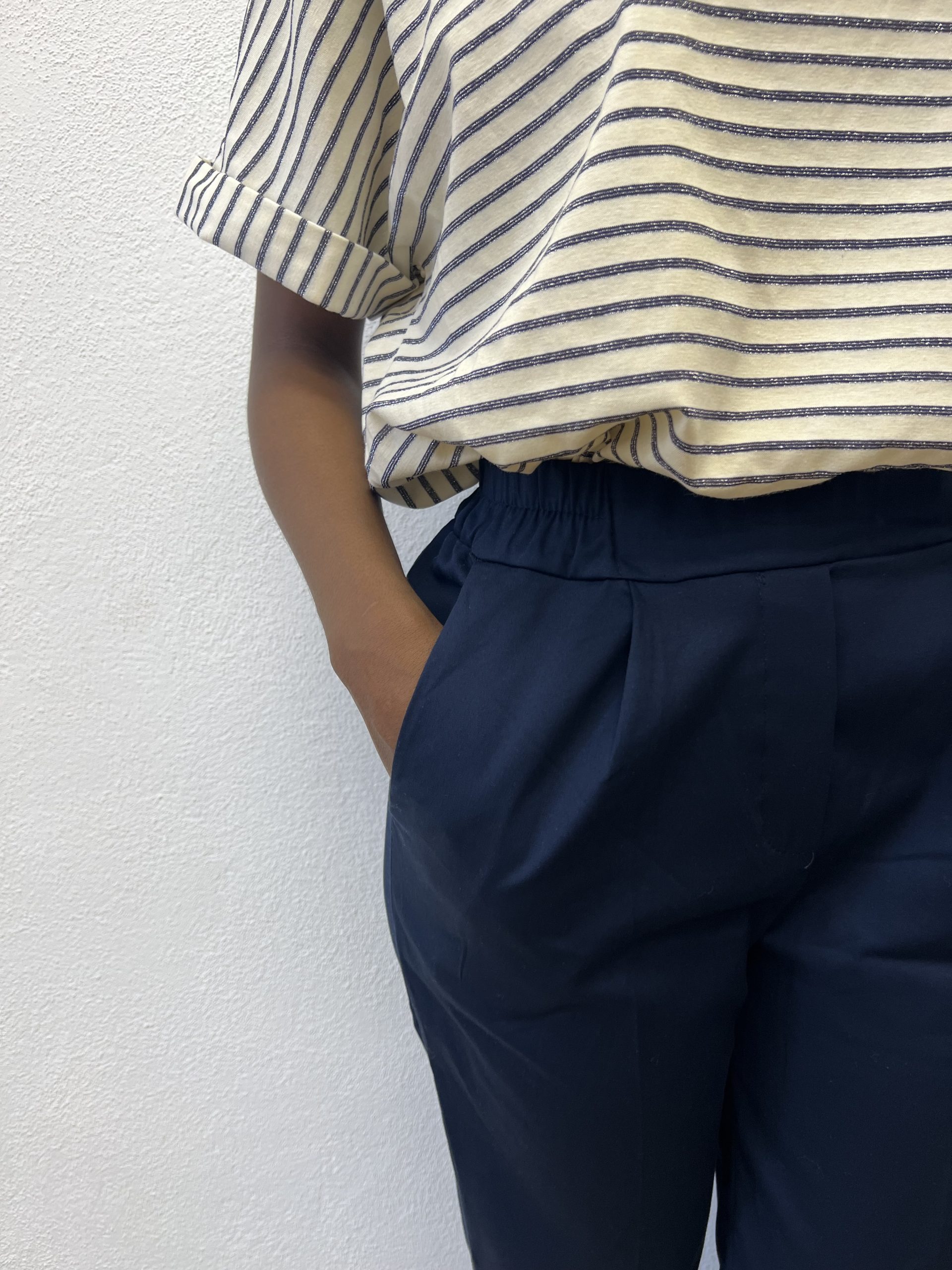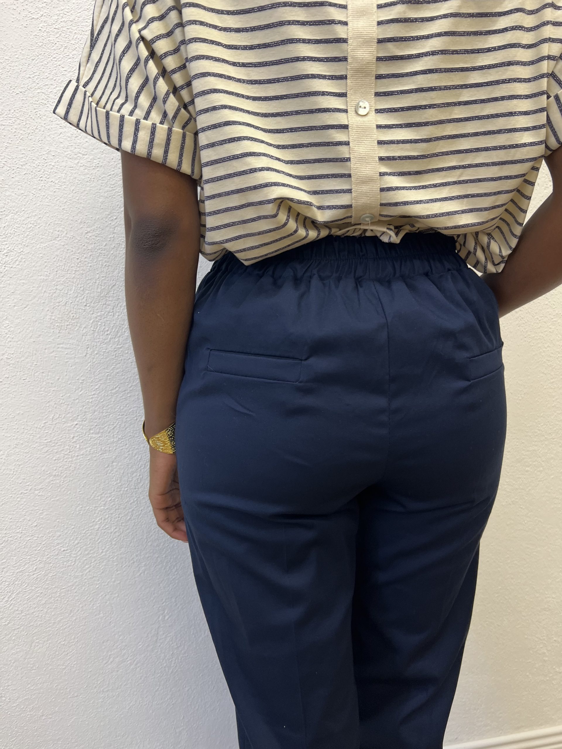 Pantalone elasticizzato sul punto vita senza cuciture con finta taschine posteriori.