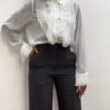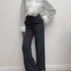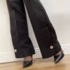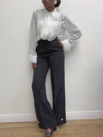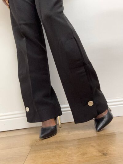 Pantalone dritto con pince sulla parte davanti a tinta unita. Dettaglio di bottone argento sulla parte finale.