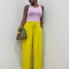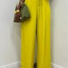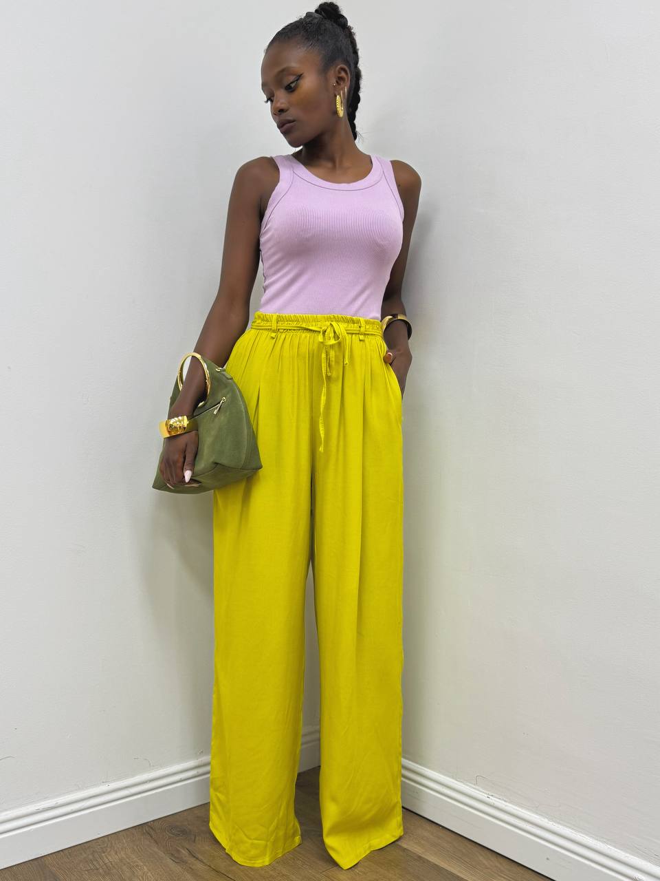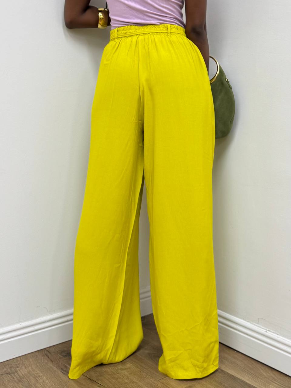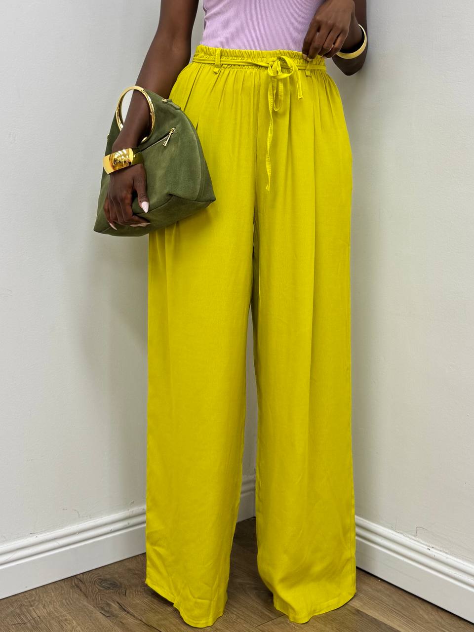 Pantalone a palazzo elasticizzato con coulisse allegato all’acquisto del pantalone a tinta unita. Taschine a filo e pince frontali.