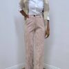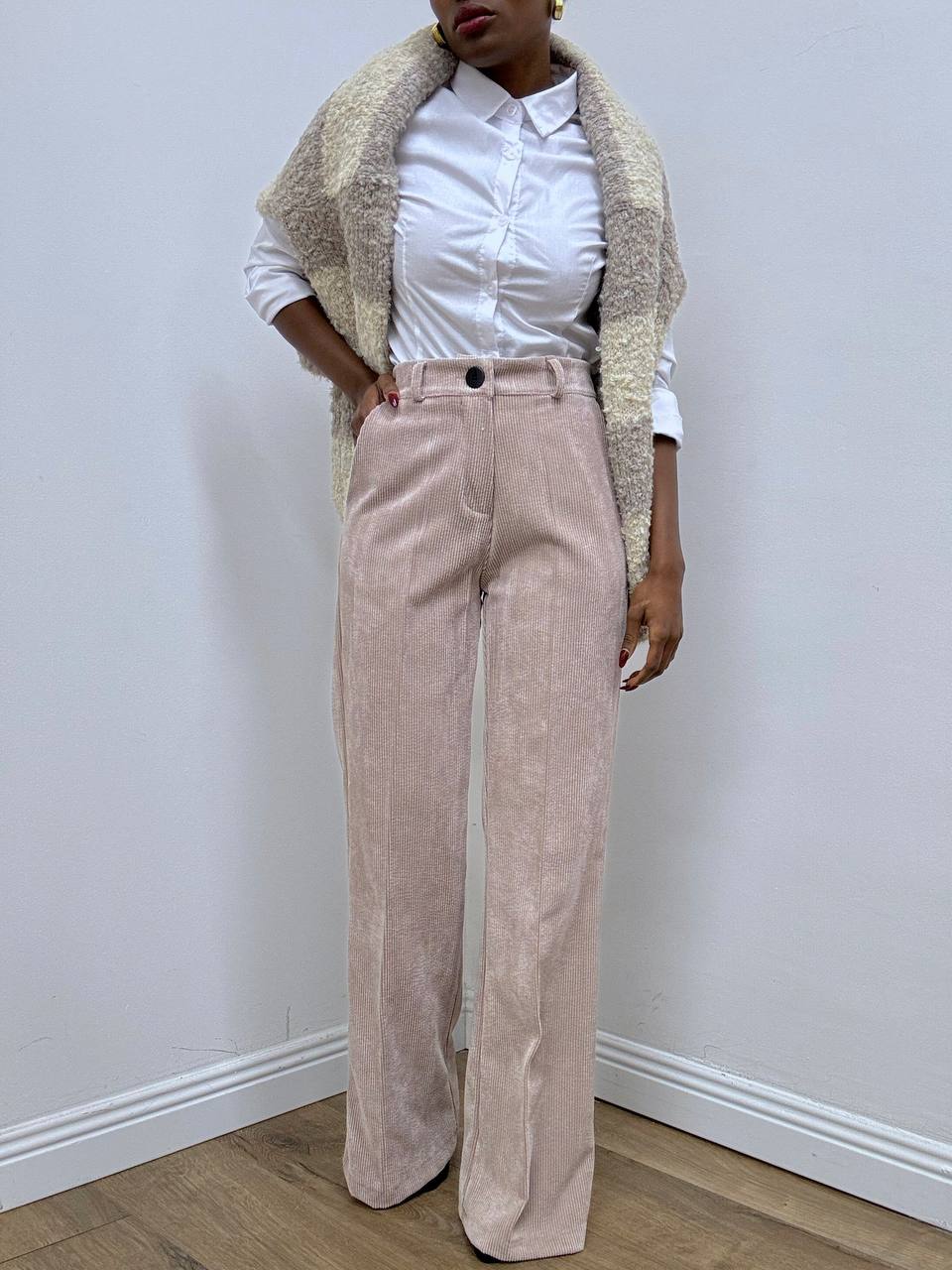 Elegante e dal gusto retrò, questo pantalone è realizzato in morbido velluto a costine, perfetto per la stagione autunnale e invernale. La gamba larga dona movimento e comfort, mentre la vita regolare è valorizzata dalla chiusura frontale con zip e bottone. Il design a  tinta unita lo rende versatile e facile da abbinare, ideale sia per look casual che per outfit più sofisticati.