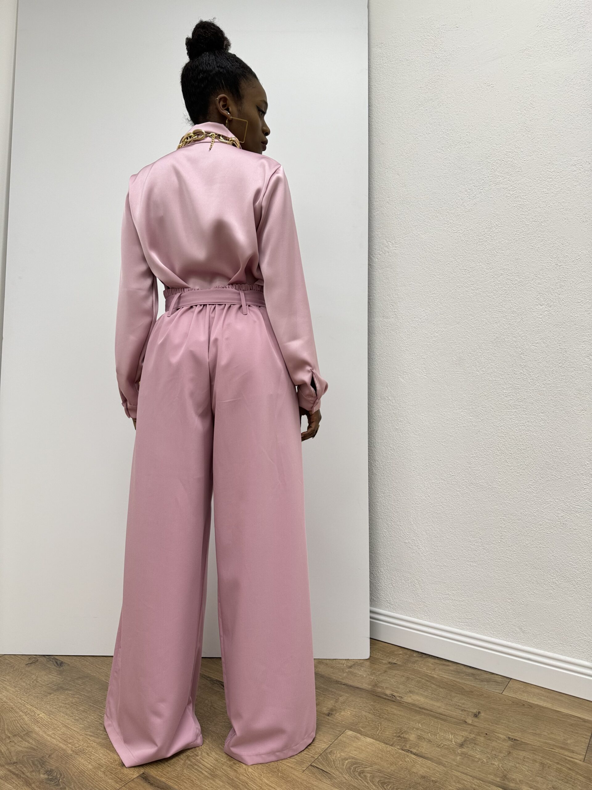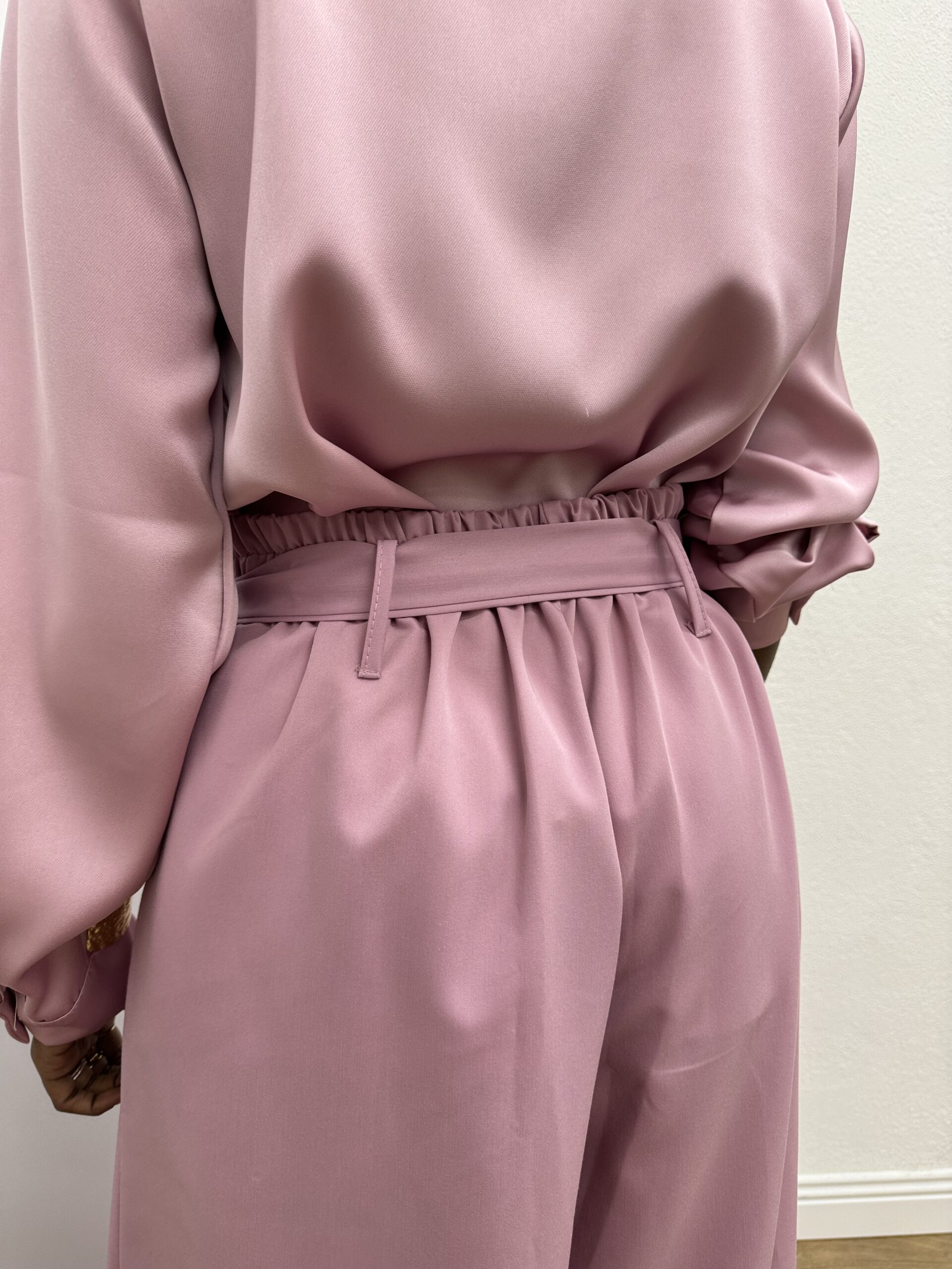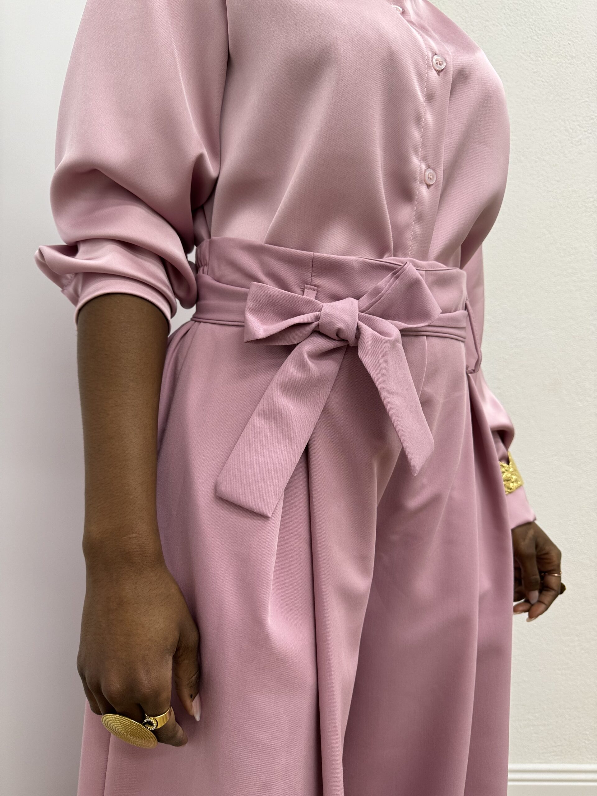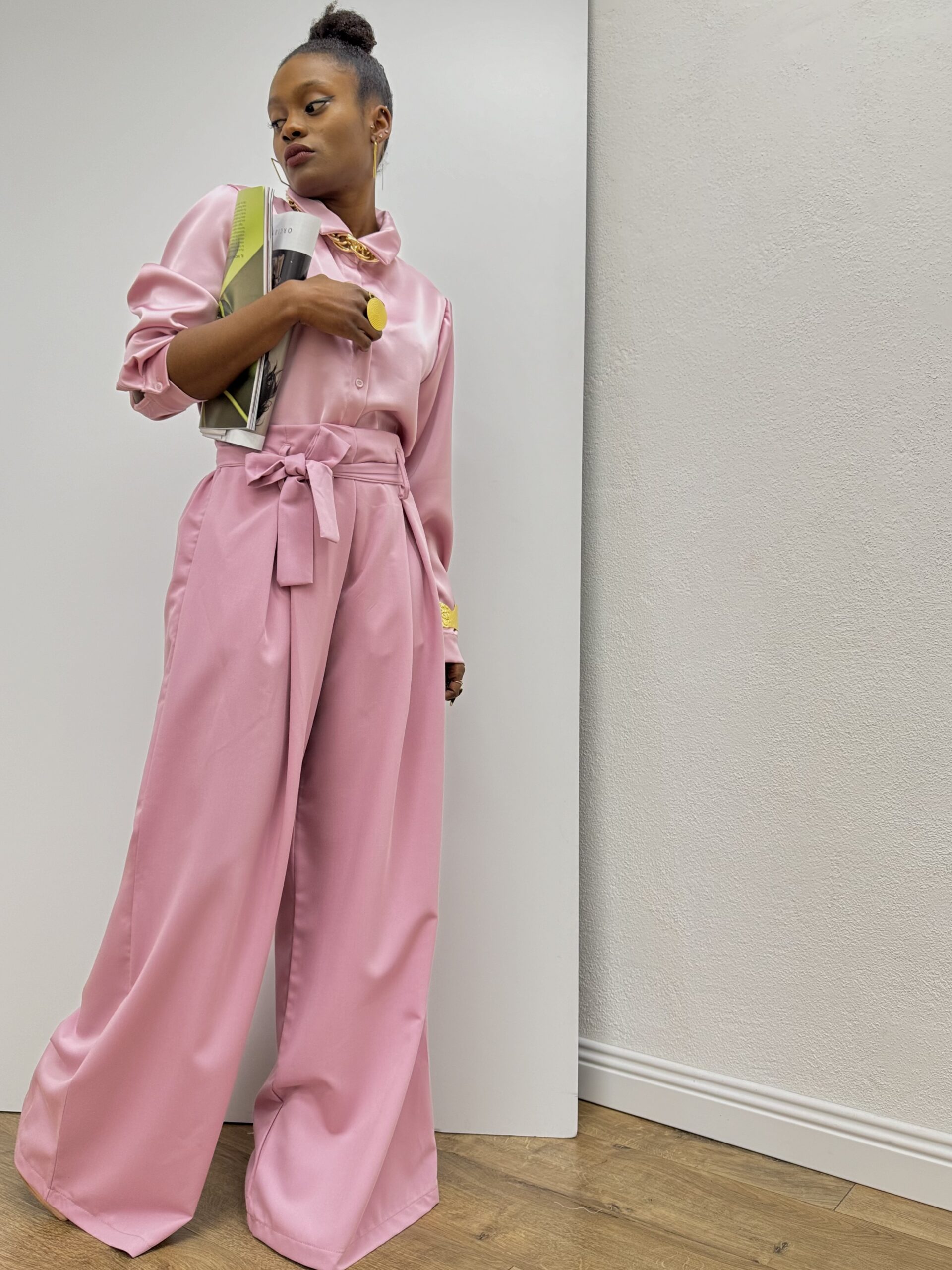 Pantalone palazzo elasticizzato con fiocco sul punto vita con dettaglio di pince frontali.