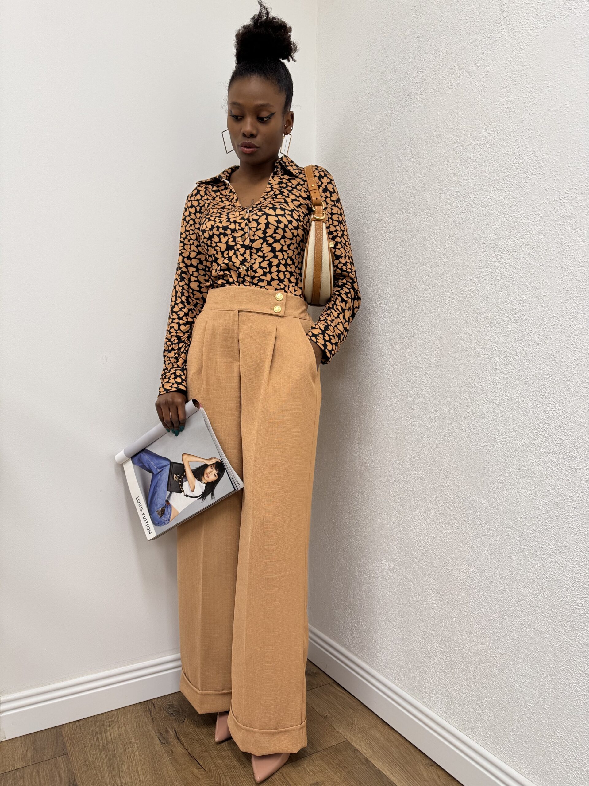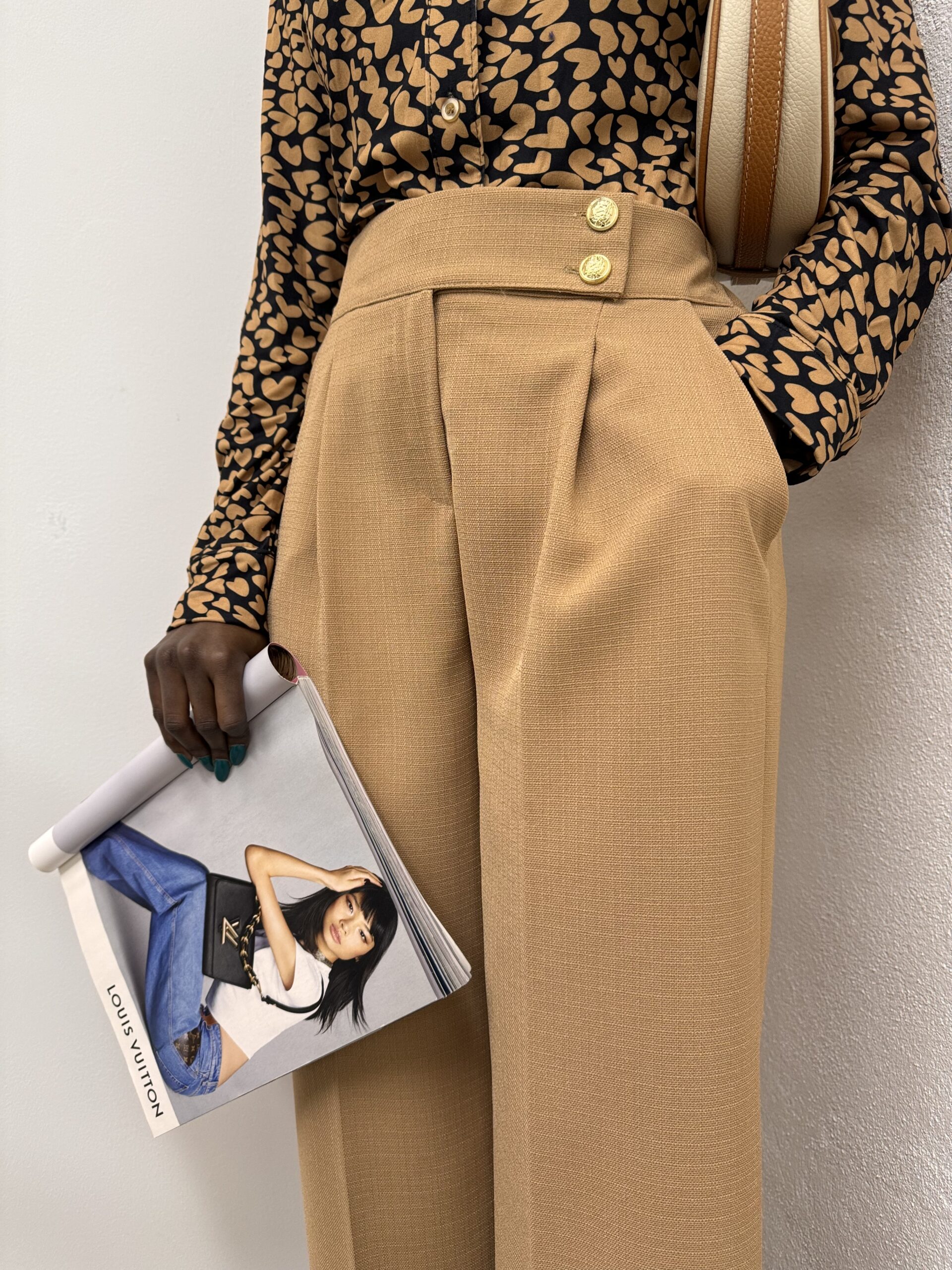 Pantalone a palazzo elasticizzato a tinta unita con dettaglio di chiusura laterale con bottone gioiello oro.