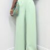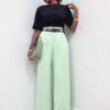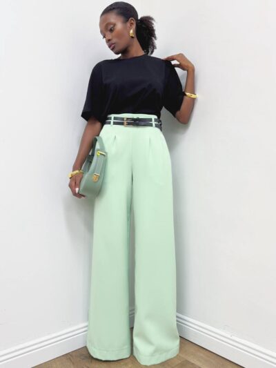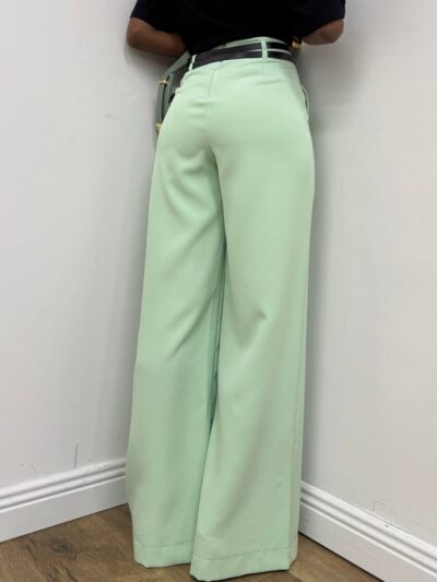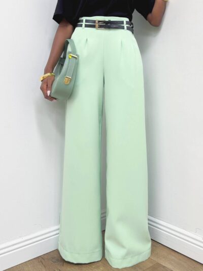 Pantalone a vita alta a gamba larga e piega frontale con dettaglio di pince e taschine con patta . Chiusura posteriore da zip . Dettaglio di cinturino incorporato allegato all’acquisto del pantaloncino a tinta unita.
