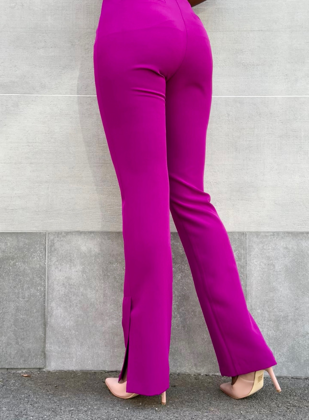 Pantalone a vita alta con cerniera di chiusura laterale a gamba stretta e mini spacchetto sulla parte finale.