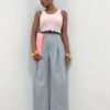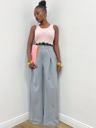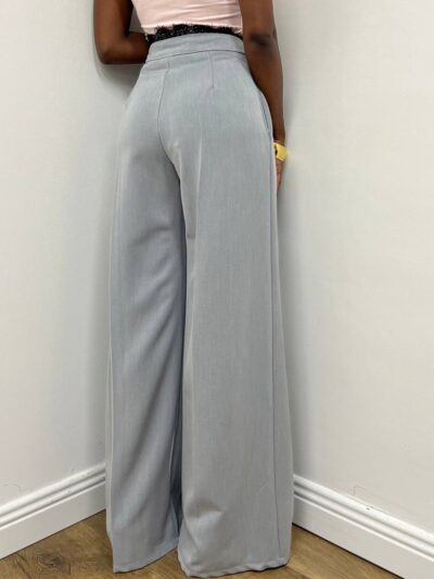 Pantalone a palazzo a tinta unita con dettaglio di pizzo sulla parte alta della vita. Dettaglio di taschine laterali. Chiusura con bottone e zip.