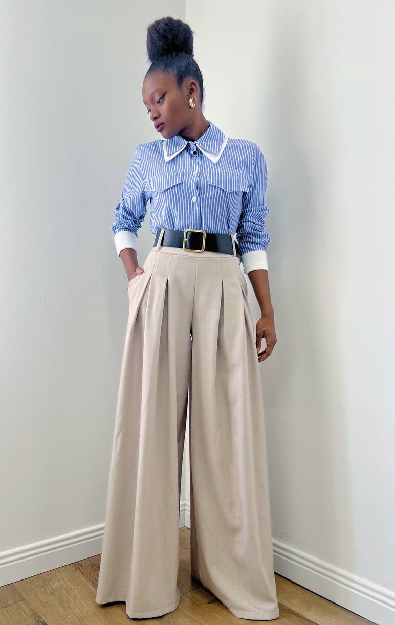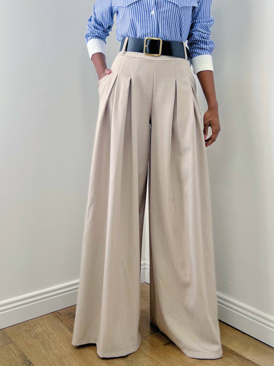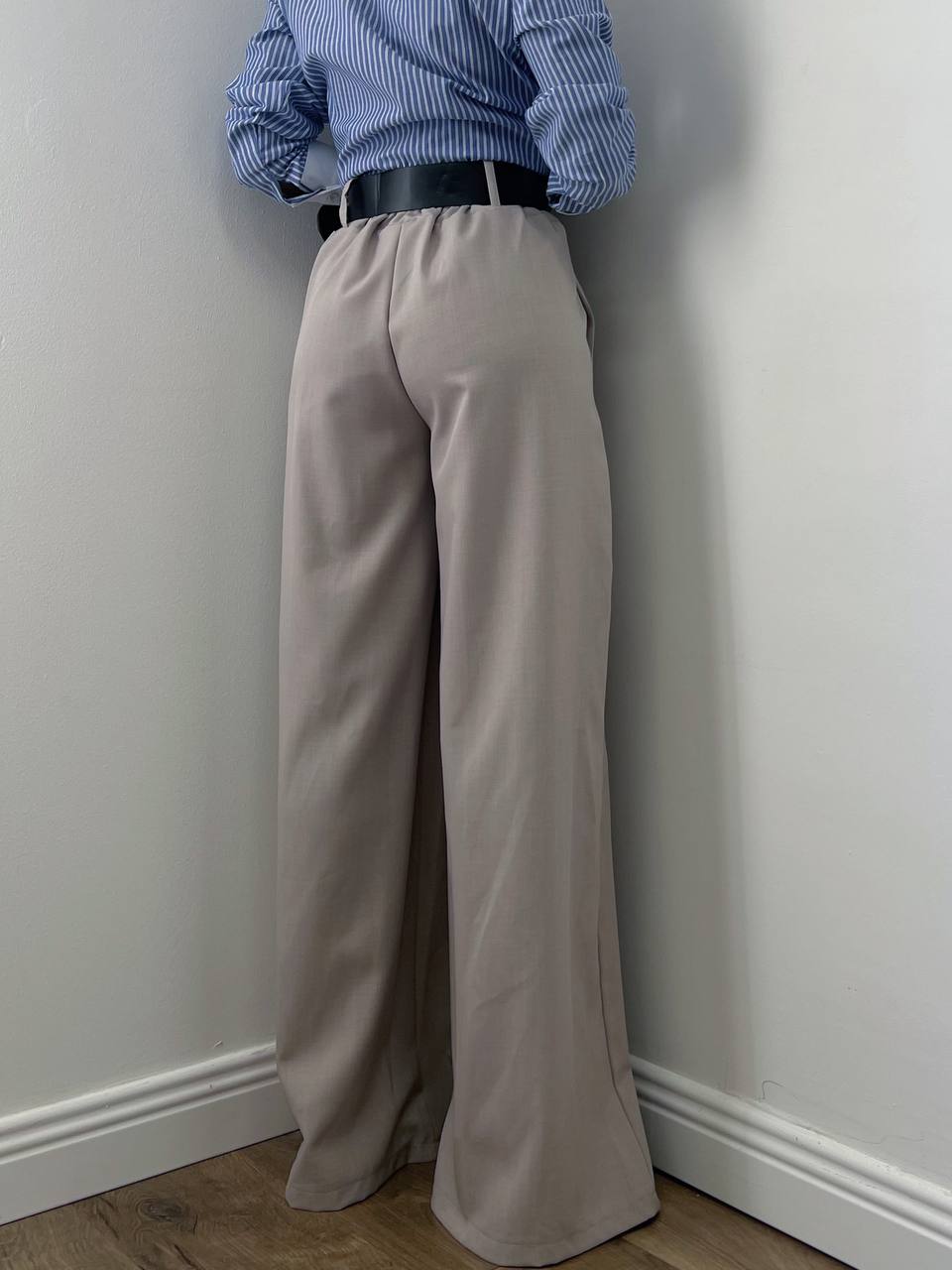 Pantalone a gamba larga con vita posteriore elasticizzata. Dettaglio di cintura sul punto vita.