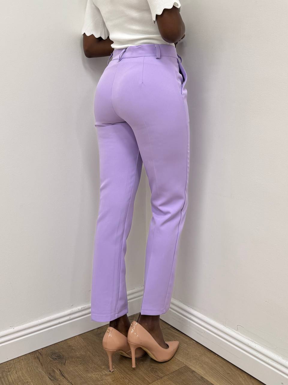 Pantalone a sigaretta tinta unita realizzato in tessuto morbido e leggermente elasticizzato per garantire comfort e vestibilita’. Il modello presenta una linea dritta e affusolata che segue naturalmente la gamba senza stringere, terminando con un orlo aderente alla caviglia. Chiusura frontale con zip nascosta e bottone in tinta, vita regolare e passanti per cintura. Un capo essenziale e versatile, perfetto sia per look casual che per outfit più eleganti.