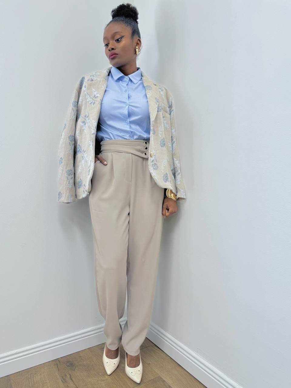 Pantalone taglio Carrot a tinta unita con vita elasticizzata con dettaglio di finti bottoni laterali.