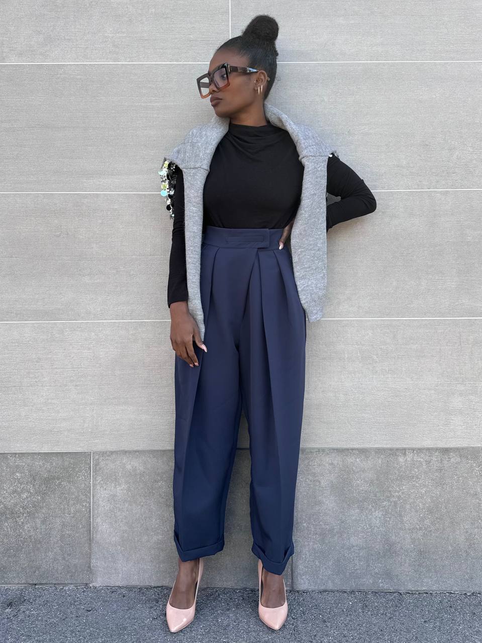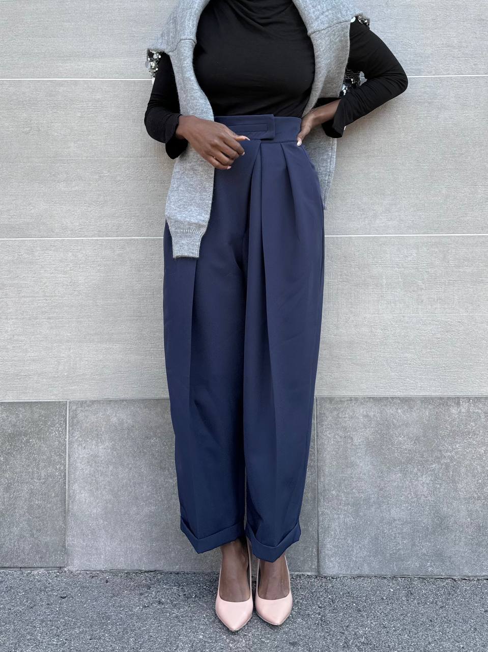 Pantalone con chiusura centrale con gancio e zip a gamba larga con dettaglio di pince e taschine laterali.