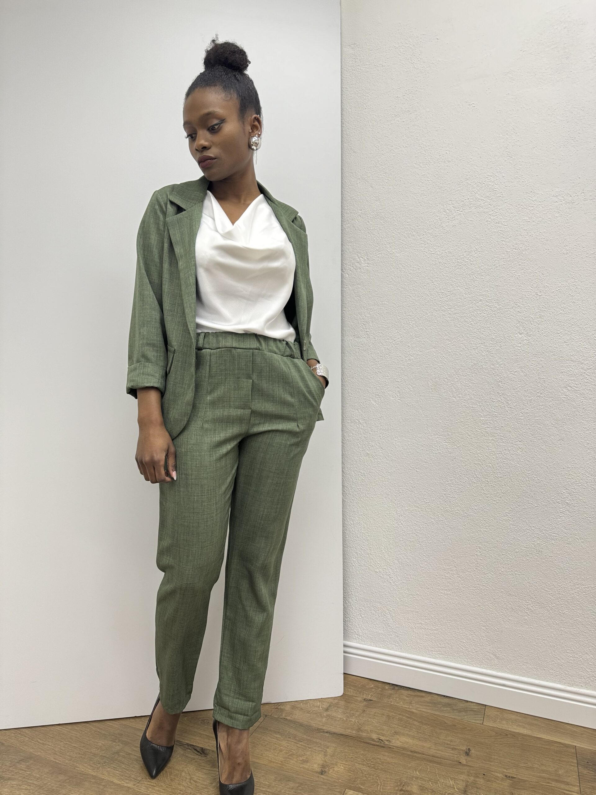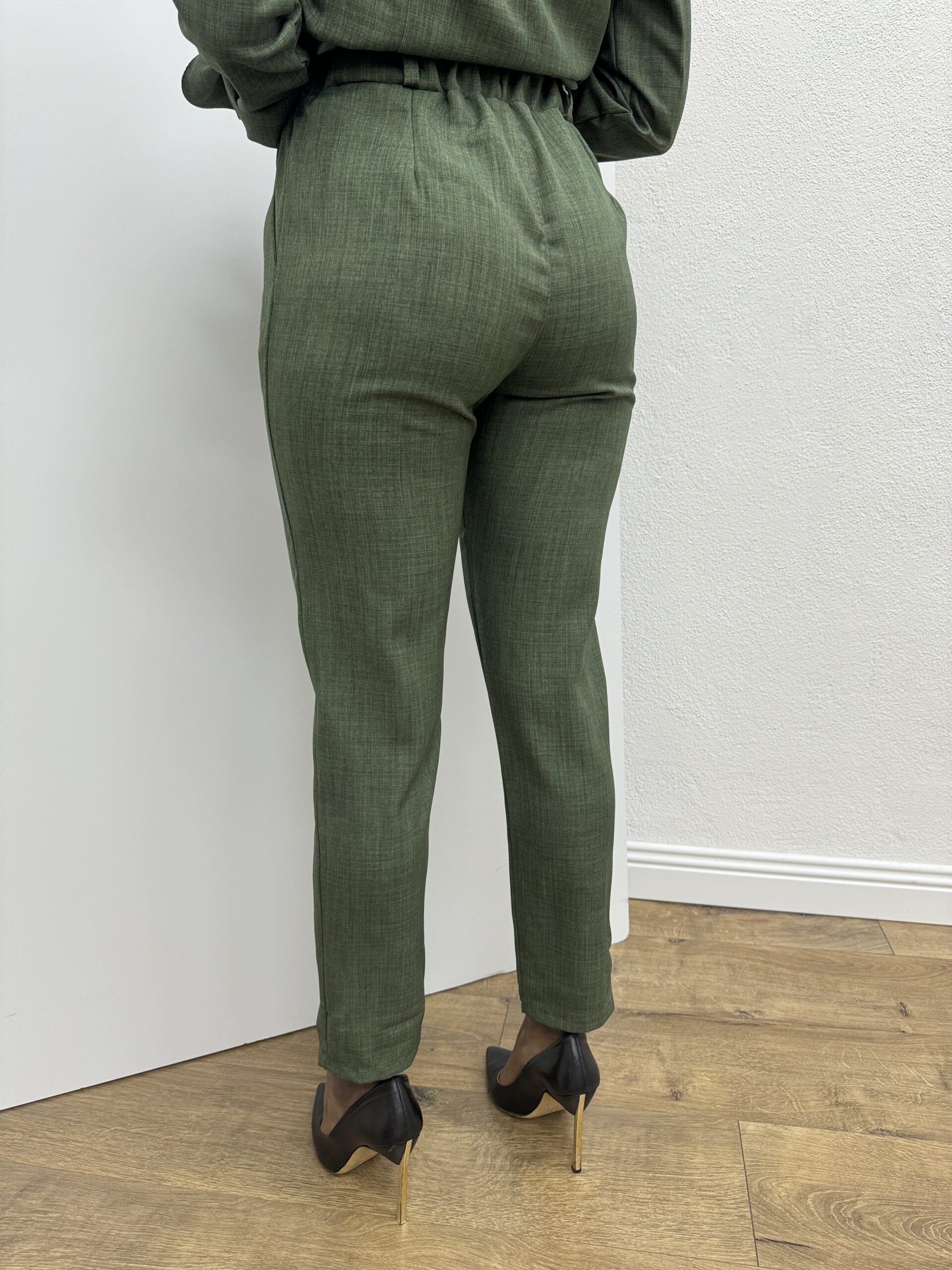 Pantalone elasticizzato a tinta unita con dettaglio di cinturino incorporato sul punto vita. Taschine laterali.