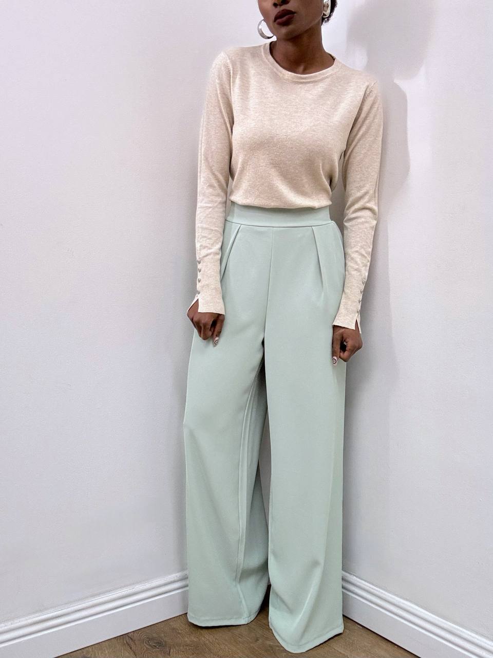 Pantalone elasticizzato dal taglio a palazzo, pensato per unire comfort e raffinatezza. La linea ampia e fluida slancia la figura, mentre il tessuto elasticizzato assicura una vestibilità confortevole e adattabile.