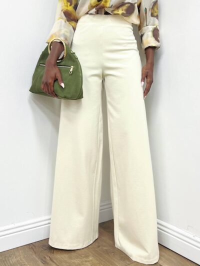 Pantalone in punto Milano a palazzo a vita alta con fascia liscia senza cuciture suggerendo un design pulito ed elegante a tinta unita.