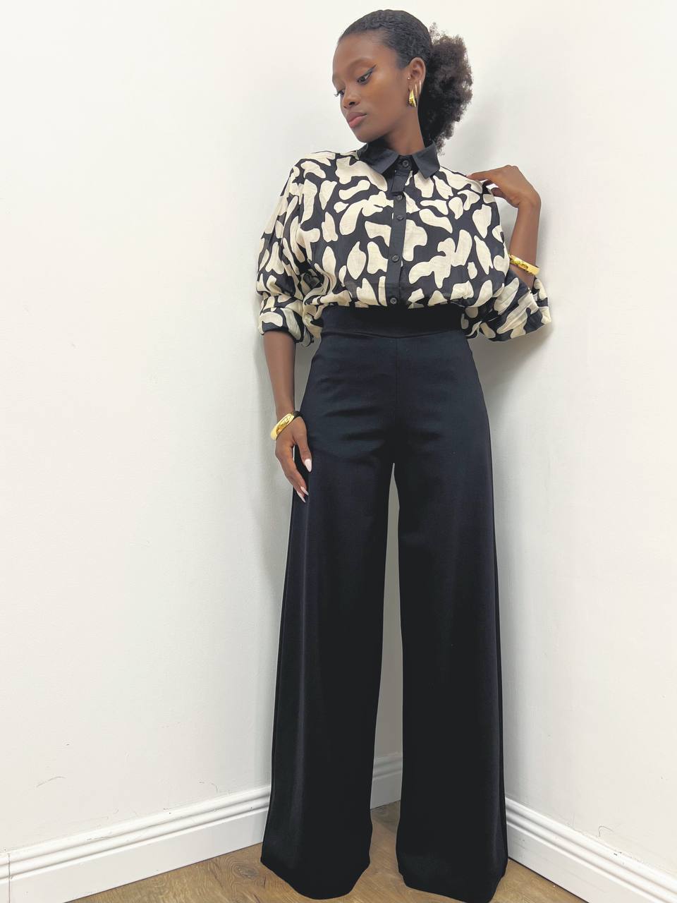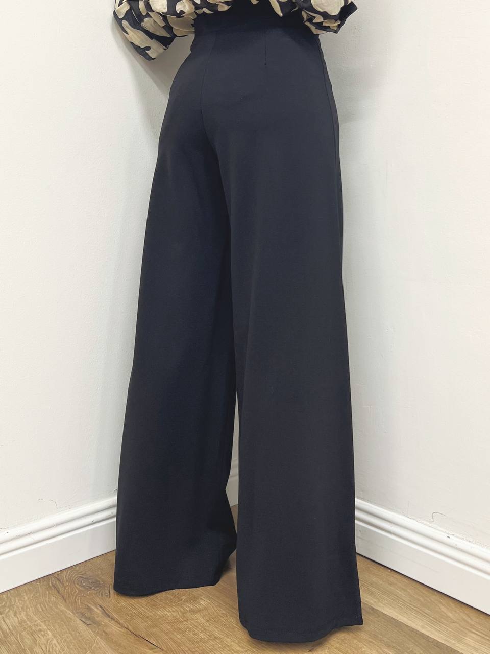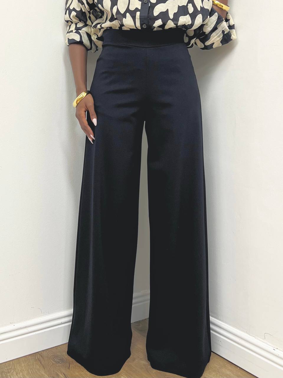 Pantalone in punto Milano a palazzo a vita alta con fascia liscia senza cuciture suggerendo un design pulito ed elegante a tinta unita.