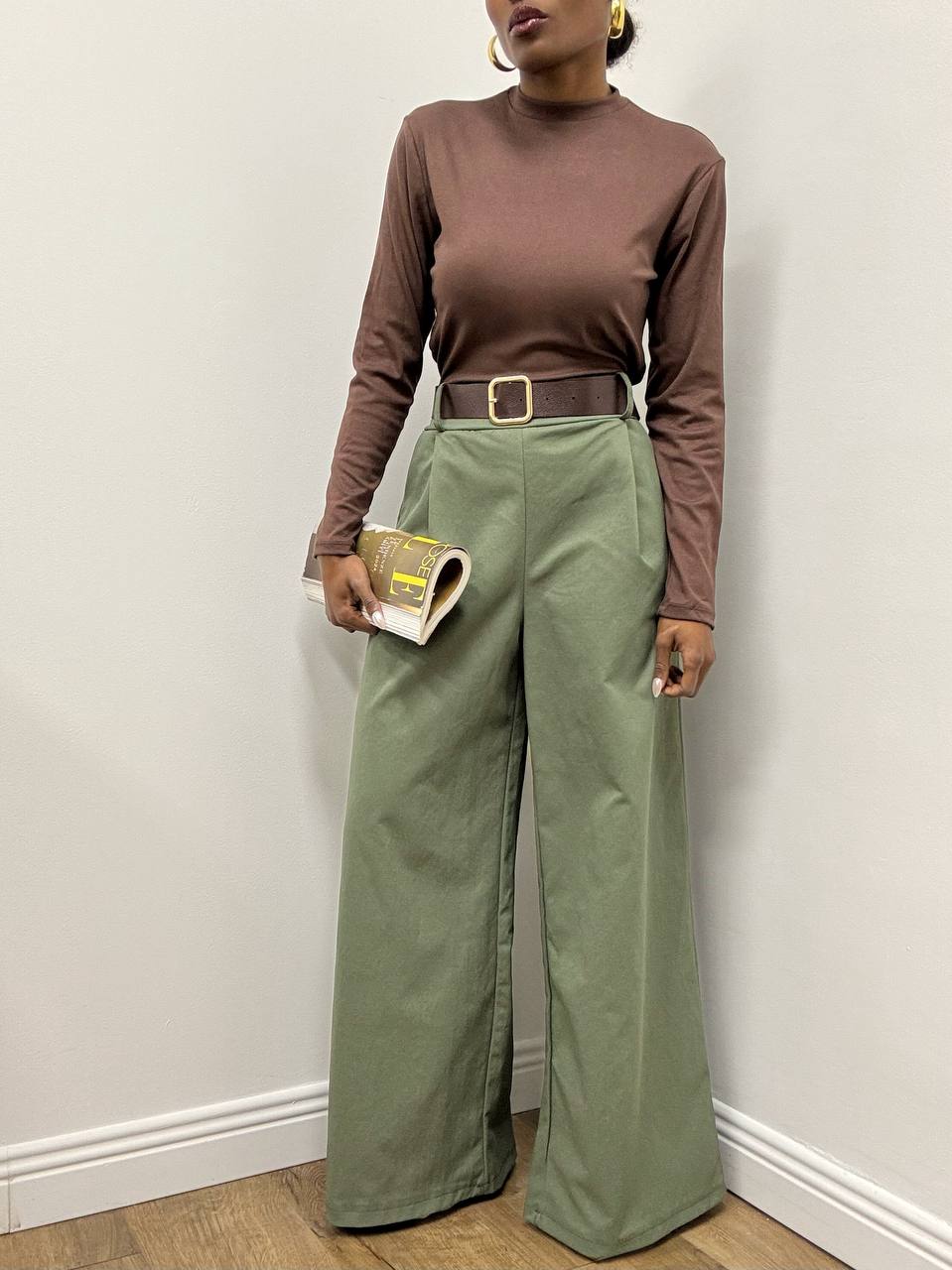 Pantalone a palazzo dal taglio fluido e raffinato, realizzato in tessuto elasticizzato che garantisce comfort e libertà di movimento durante tutta la giornata. La linea ampia slancia la silhouette, donando un’eleganza naturale e contemporanea.