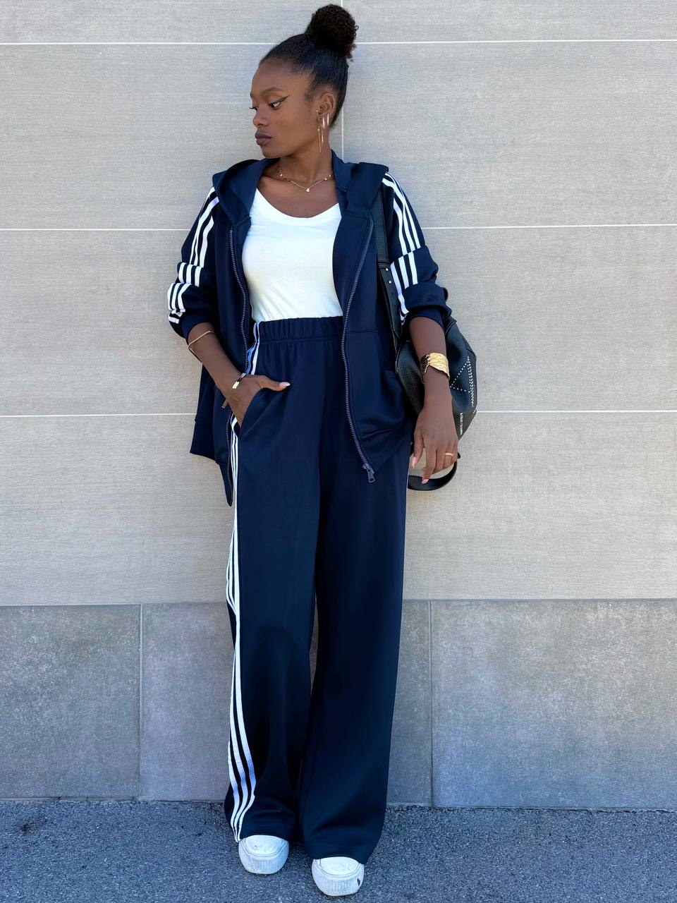 Pantaloni elasticizzati con banda laterale su tutta la lunghezza.