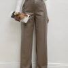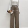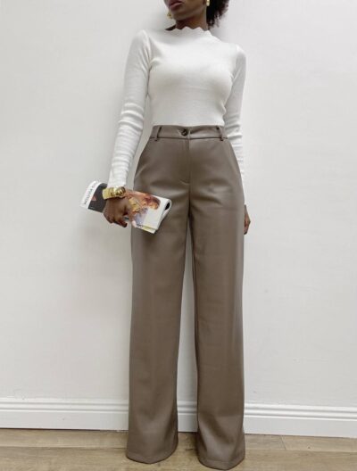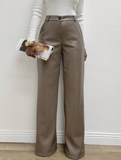 Pantalone a palazzo realizzato in tessuto spalmato effetto ecopelle, dal finish lucido e dalla linea sofisticata. Il design elegante si distingue per la silhouette morbida e fluida, valorizzata da due pratiche taschine laterali La chiusura frontale con zip nascosta e bottone dona un tocco pulito e contemporaneo, mentre i passanti in vita permettono di personalizzare il look con la cintura preferita. Perfetto per aggiungere un twist deciso e raffinato al tuo guardaroba quotidiano.