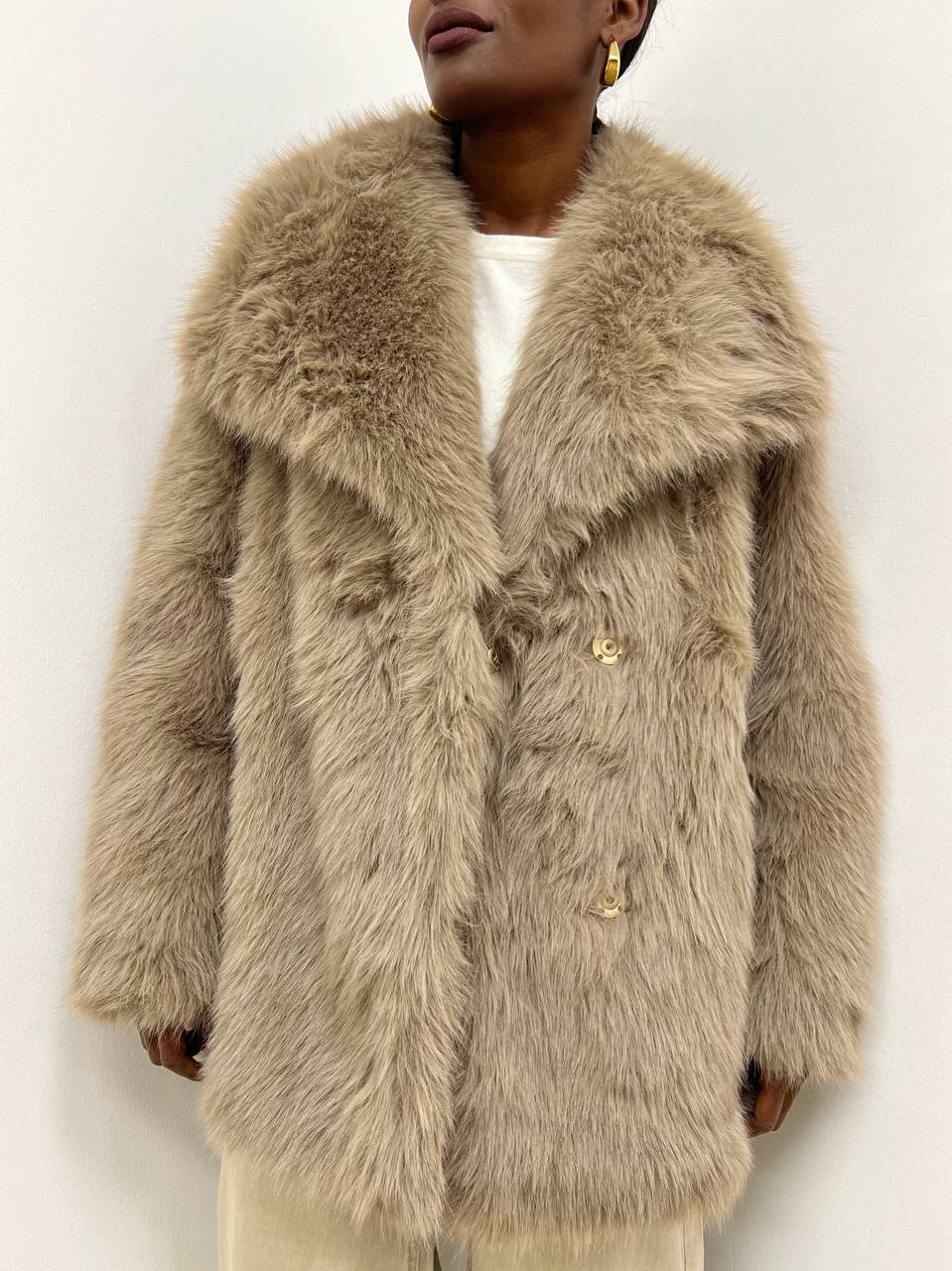 Il modello presenta una linea moderna e pulita, valorizzata da una chiusura con due bottoni a pressione sapientemente nascosti all’interno della pelliccia, per un effetto minimale e sofisticato.