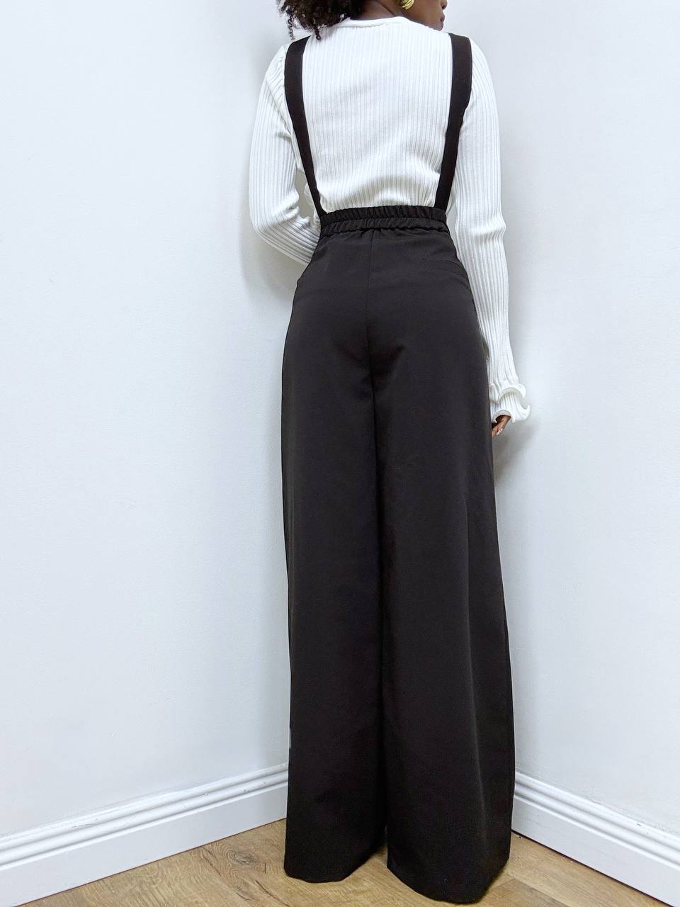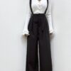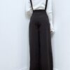 La vera particolarità risiede nelle bretelle con doppia abbottonatura: un sistema interno, discreto e pratico, studiato per assicurare stabilità e comfort, affiancato da un secondo punto di abbottonatura esterno, visibile e decorativo, che aggiunge un raffinato tocco sartoriale. Un dettaglio ricercato che conferisce alla salopette un’estetica sofisticata, perfetta sia per outfit eleganti sia per look più audaci e contemporanei.