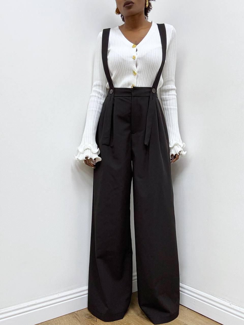 Salopette con pantaloni a vita alta dal design contemporaneo, pensata per valorizzare la silhouette con eleganza e carattere. Le bretelle regolabili si uniscono sul davanti tramite bottoni, creando un dettaglio funzionale che diventa anche elemento distintivo di stile.